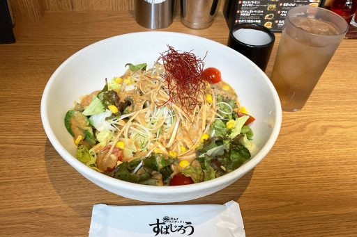 リニューアルして、店内・外観・ディスプレイなどがキレイになったすぱじろう。まだ、7月31日だけど、8月のおすすめすぱが味わえるので「すぱじろうバンバンジー冷製サラダすぱ」1350円(税抜)をオーダーしました。Lサイズまでは同額なので、Lサイズで注文だ!