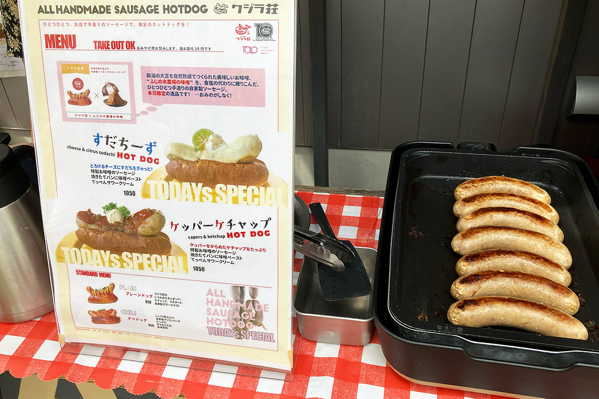 新潟の大豆100%を天然熟成で作った"ふじの木農場の味噌"を食塩の代わりに使用した、今回特製のポークソーセージを使ったホットドッグが味わえます。めちゃめちゃ美味しそう!