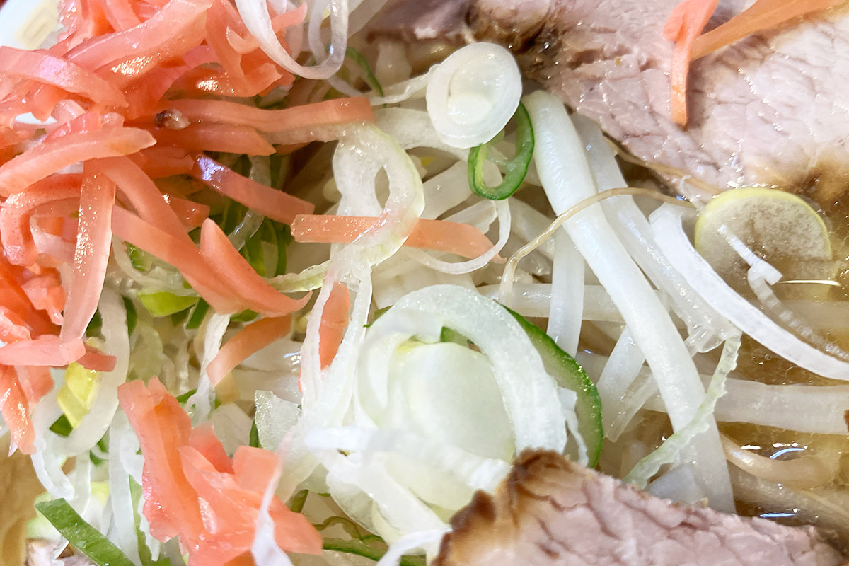 もやし麺はたっぷりのもやしが特徴的、シャキシャキ食感と絶妙な茹で具合の中太ちぢれ麺との相性は抜群です。薄切りチャーシューに紅生姜と、一龍でなければ味わえない組み合わせです。