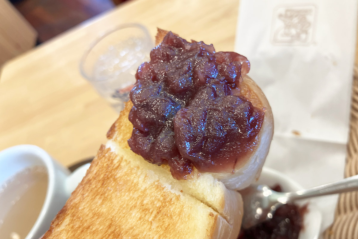 たっぷりサイズのカフェオレに、外はサクッと中はモチッとした厚切りトースト。おぐらあんをたっぷりと付け、あんこトーストにして味わう。いやー、これぞコメダのモーニングですよ! トーストはハーフサイズですが、厚切りであんこも付けると食べ応えがあります。