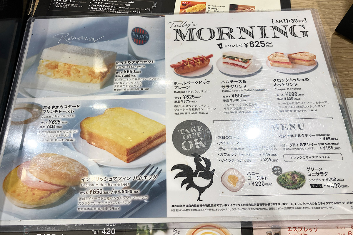 お店の外に特に掲示されていませんでしたが、レジで「モーニングメニュー」を確認。朝8時から11時半まで頼めるのは素晴らしいですねー。サンドと悩みましたが、「ボールパークドッグ プレーン セット」625円(税込)をオーダーしました。ドリンクは「本日のコーヒー」「アイスコーヒー」「ティー」のShortサイズから選べますが、+66円でTallサイズに、+132円でGrandeサイズにすることもできます。また、+44円でカフェラテ、+66円でロイヤルミルクティーに変更もできます。