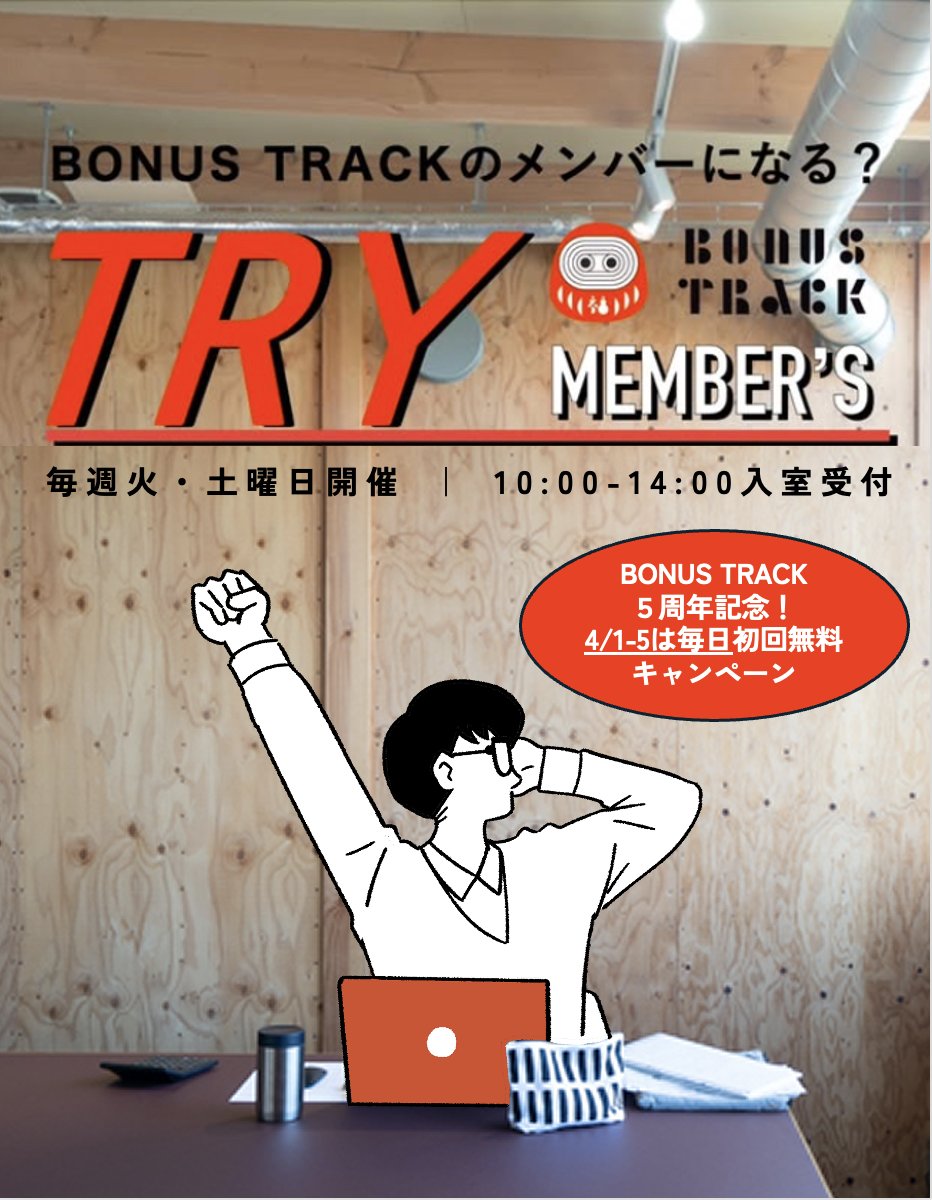『BONUS TARACK』の5周年を記念し、コワーキングスペースを初回無料で使えるキャンペーンを開催! 毎日10時~14時に入室受付を行っていますー。ぜひ、この機会にBONUS TRACKで働いてみましょう!!