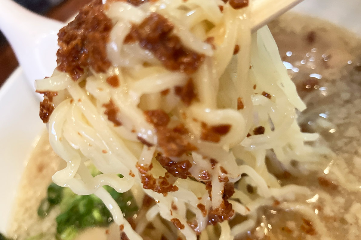 背脂は浮いていますが、比較的あっさり目の豚骨醤油。味噌じゃないスープを初めて味わったからかもしれないけど、さらにあっさりしていますね。スタンダードな中細ちぢれ麺は、ミニサイズでも十分。ちなみに+100円でレギュラーサイズにもできます。大ぶりのチャーシューも変わらない味、なんというか全く変化がないのが『麺僧』最大の特徴かも知れません。