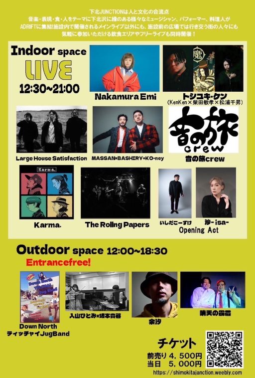 「下北JUNCTION」は人と文化の合流点を標榜し、音楽・表現・食・人をテーマに下北沢に縁のある様々なミュージシャンやパフォーマー、料理人がADRIFTに集結するイベントです。ADRIFT内で開催されるメインライブ以外に、ADRIFT前のスペースでは下北沢行き交う人々も気軽に参加できる飲食エリア「シモジャン食堂」やフリーライブも開催されます。