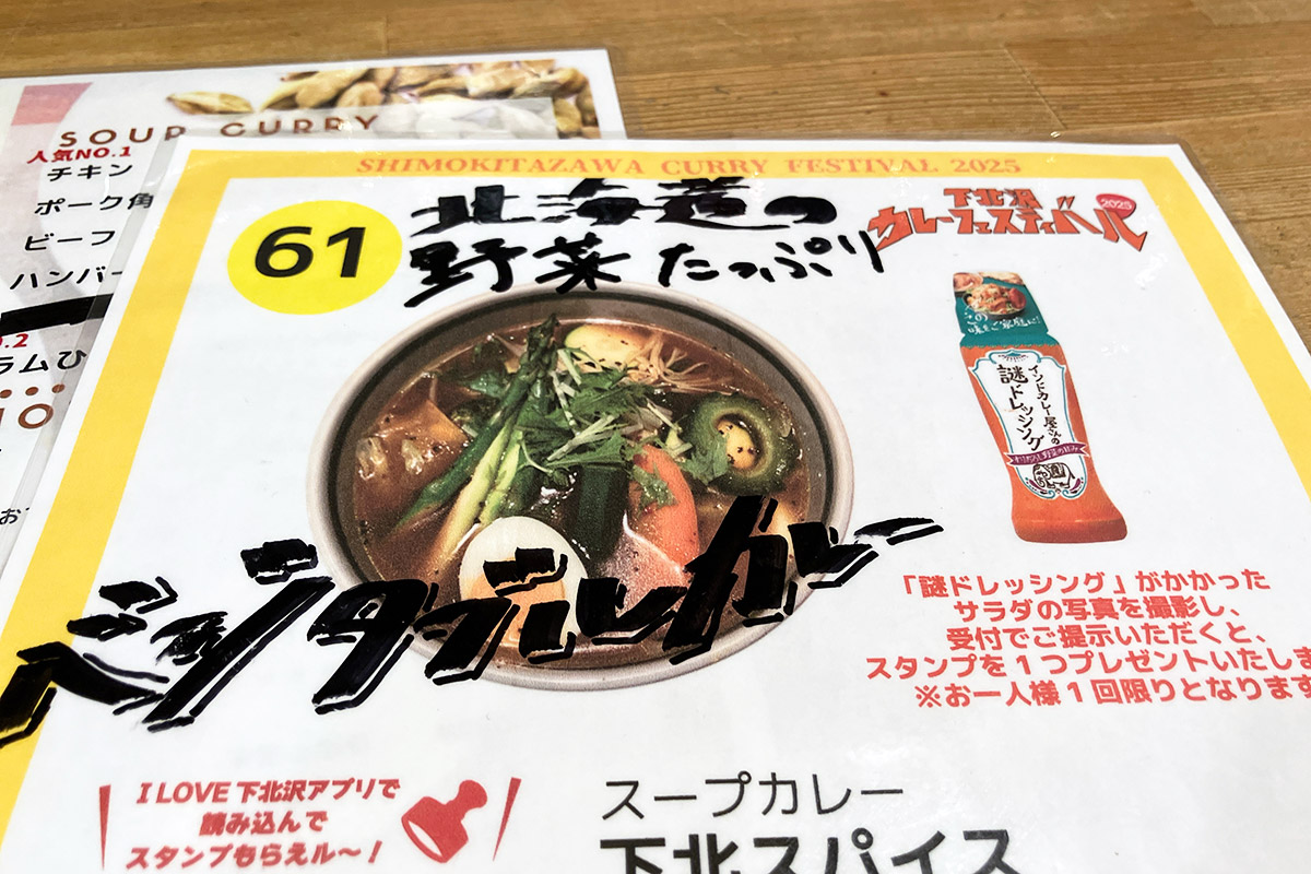 2025年26日(日)まで下北沢の飲食店103店舗で開催されている『下北沢カレーフェスティバル2025』。イタ飯Raguuun「スパイス香る 白ミートソース スパゲッティ」に続いて9軒目にご紹介するのは、下北スパイス「北海道夕張直送野菜を使ったスープカレー」です。