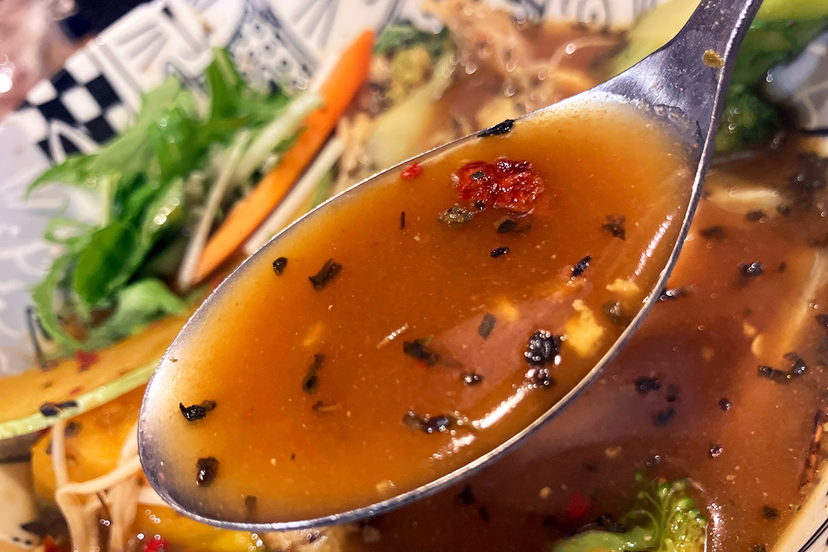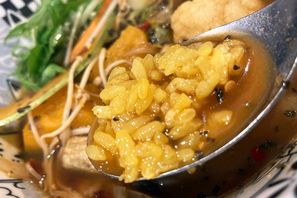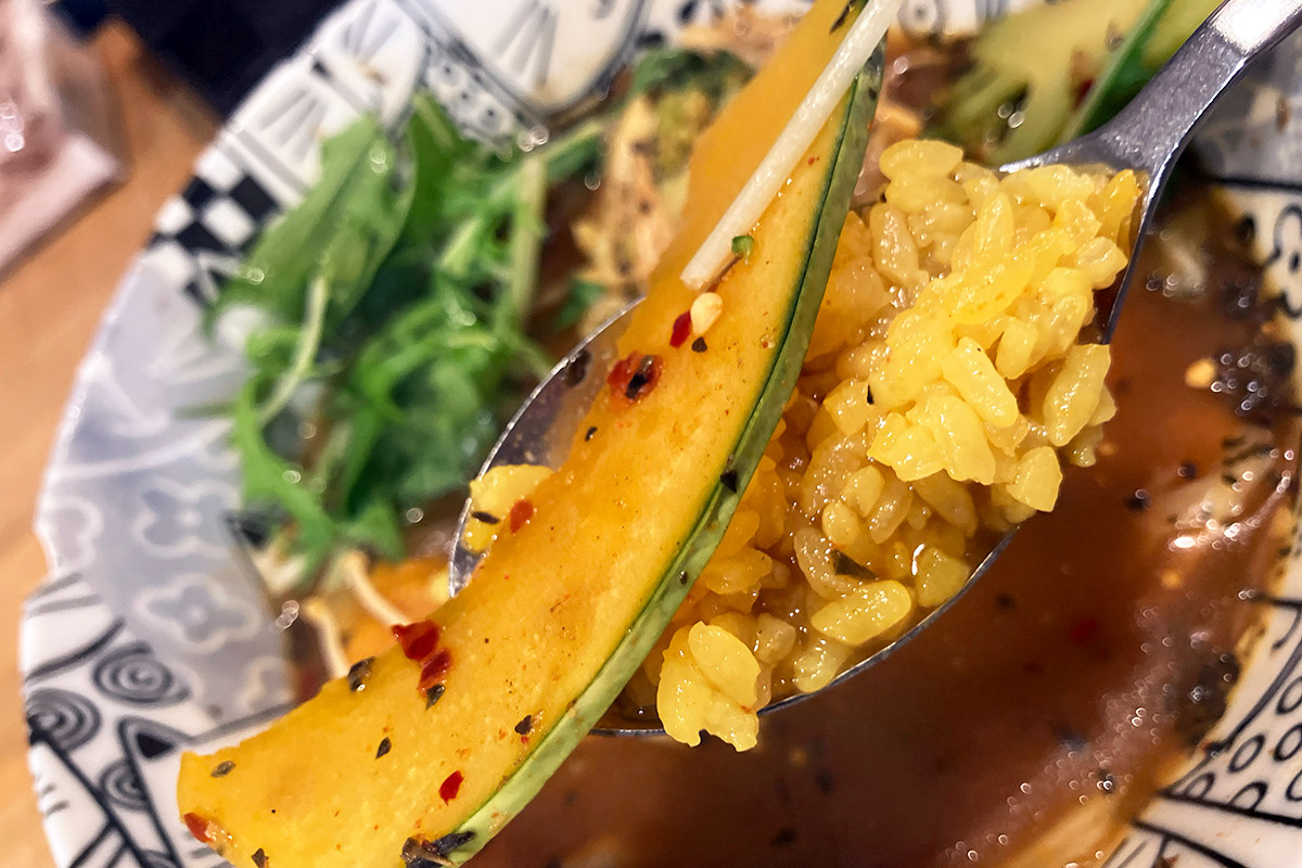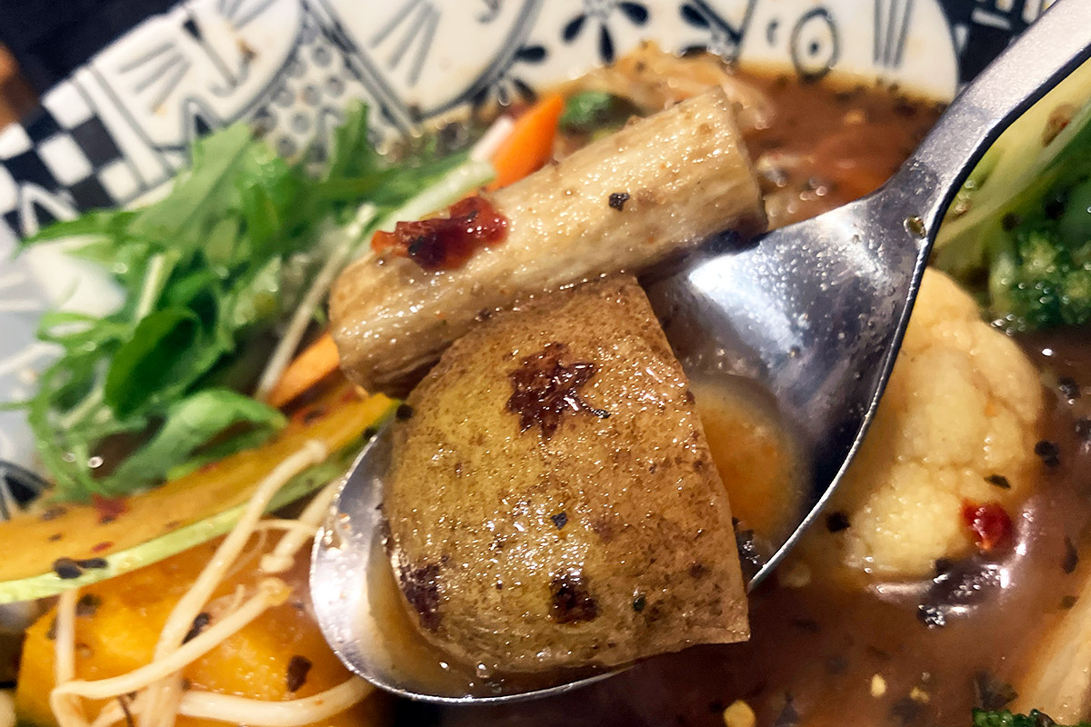 ゴボウにジャガイモ、カボチャ、玉ねぎ、ブロッコリー、カリフラワー、ニンジンなどなど、北海道夕張市小野農園直送の野菜をたっぷりと使ったスープカレーは、ヘルシーなのに満足感が高い味わいです。スープカレーの名にふさわしいたっぷりスープも嬉しいですね。