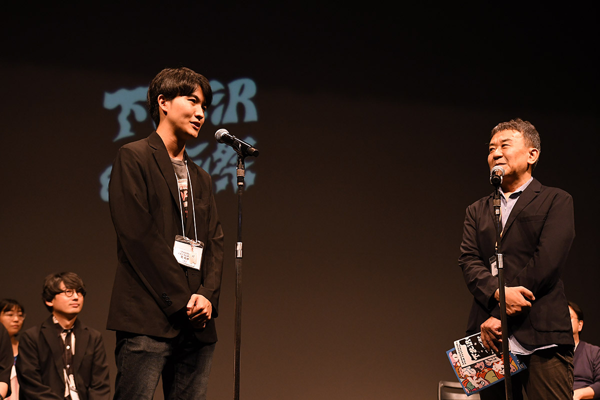 上映後、前東京国際映画祭ディレクターの矢田部吉彦さんに講評を受ける、乾拓歩 監督