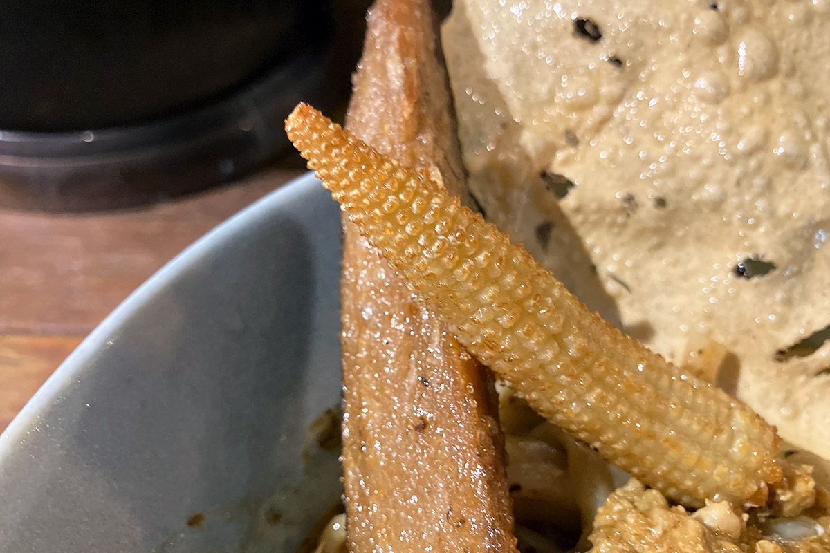 そう、去年はこんなに彩り豊かだったっけ? と思いましたが、今年からブロッコリーとゴボウ、ベビーコーンが追加されていました。このゴボウの美味しさは『点と線.』好きの皆さんならご存じだと思いますが、この揚げブロッコリーが更に美味しい! なんだろ、スパイスで下味がついているのかな、単品でも美味しいお酒が飲みたくなる逸品です。