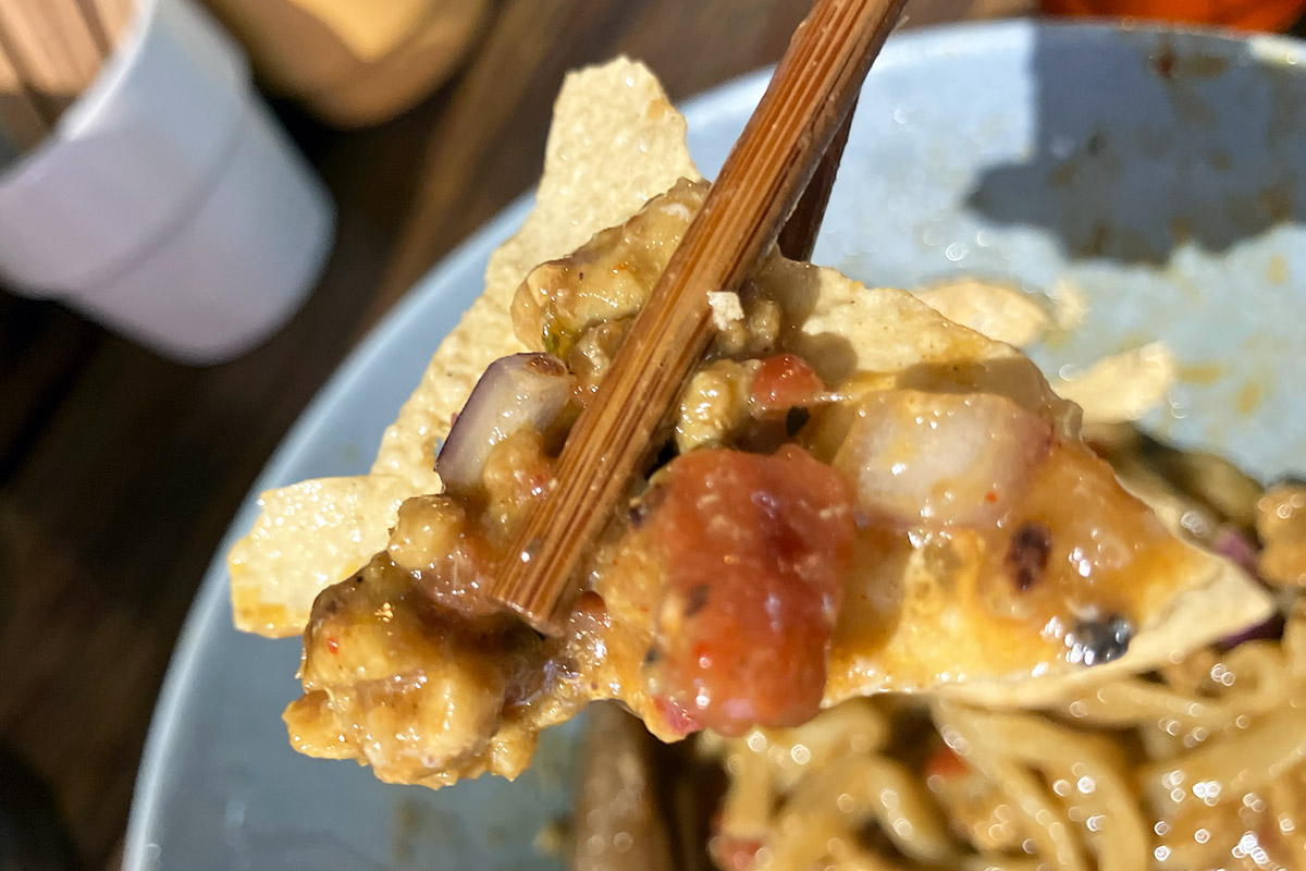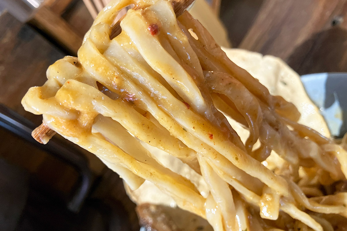 タレとスパイスが麺の下にあるのでしーっかりとかき混ぜます、満月をイメージした卵黄も一緒にかき混ぜましょう。というわけで、まずは一口。昨年はそこまで強くありませんでしたが、今年は結構スパイス感がある味わいですね。そして、めっちゃもちもちの麺が特徴的でおいしい! もっちもち感が凄まじくて混ぜるのがちょっと大変なくらいでしたが、メッチャ食べ応えがあります。