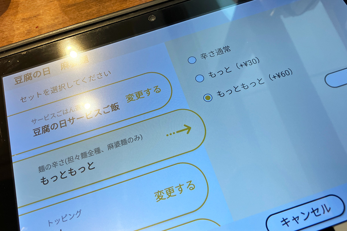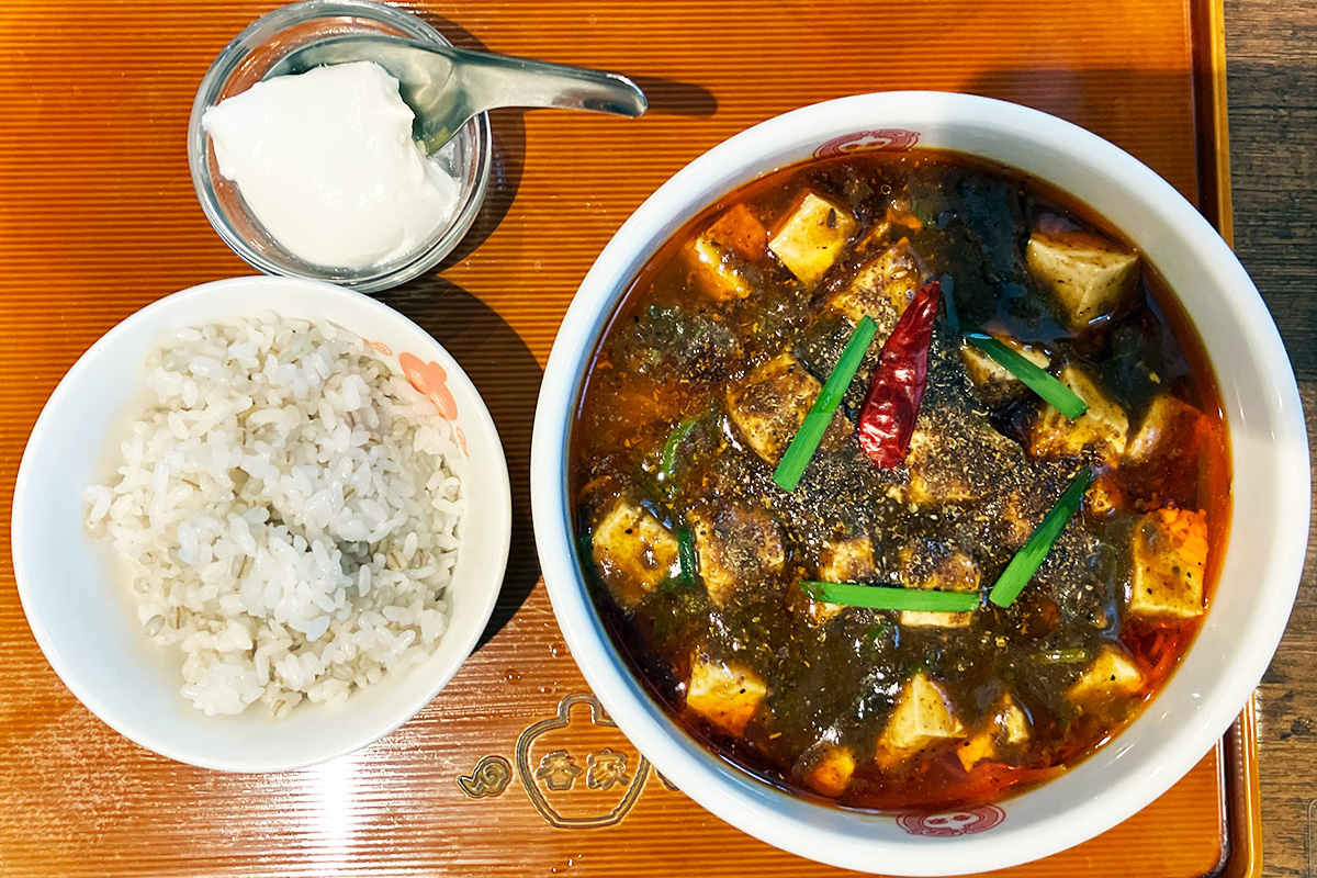 オーダーしたのは「麻婆麺」に「もっともっと辛く」オプション+60円(税込、以下同)をつけ、さらにサービスの「丸麦入りごはん」180円もつけました。あ、LINEクーポンで「ミニ杏仁豆腐」もつけちゃいましたー。