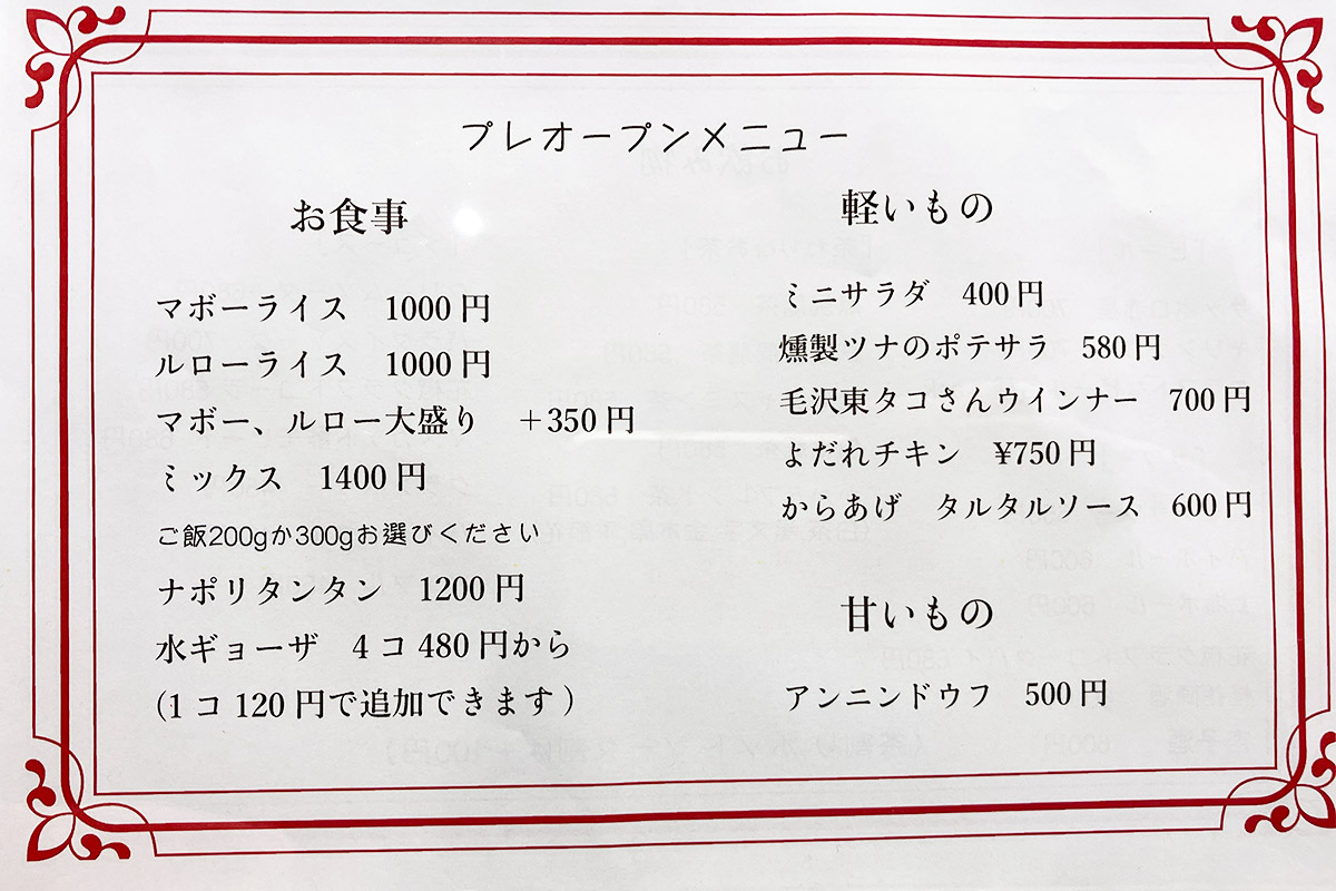 「マボーライス」「ルローライス」と並びお食事メニューに示される「ナポリタンタン」