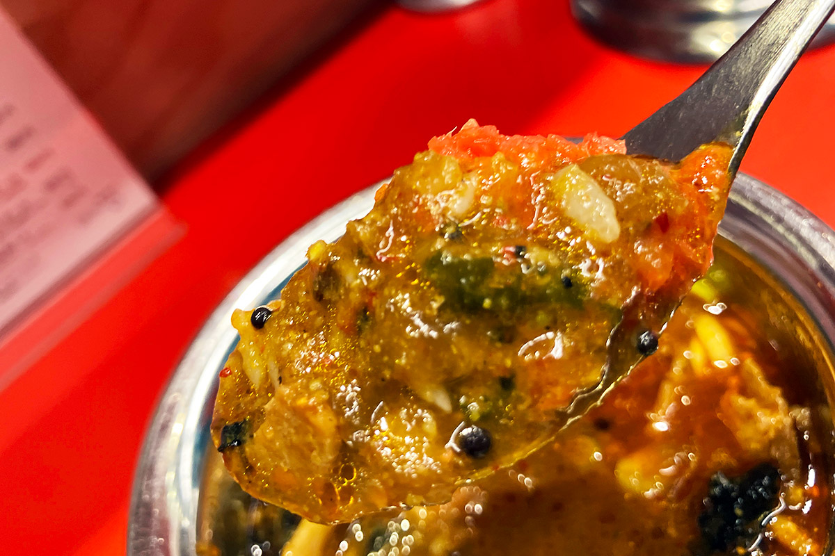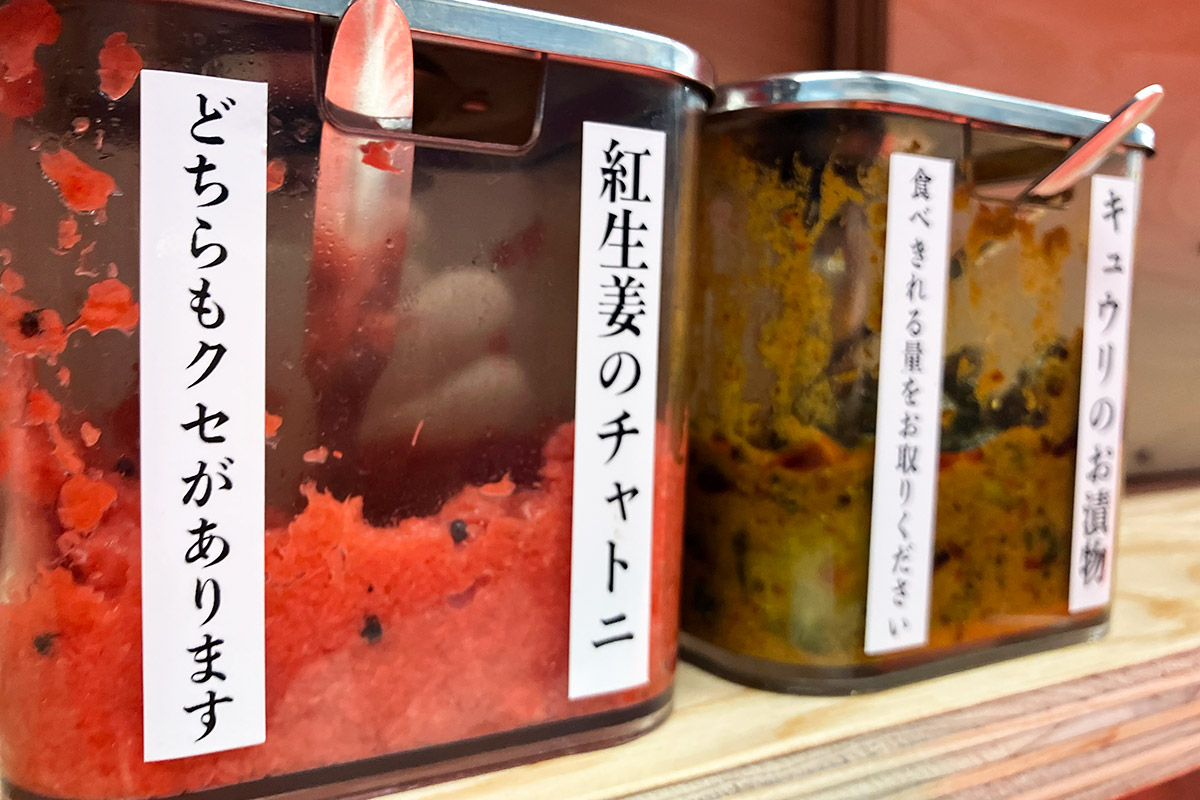 卓上にある「紅ショウガのチャトニ」や「キュウリのお漬物」を合わせてみても旨い、なんだか旨すぎて笑えてきた。何なのこのカレー、どうなってんの?