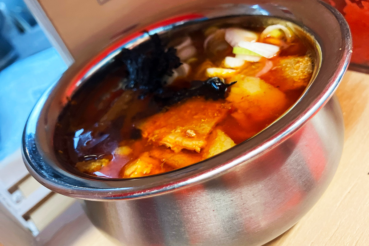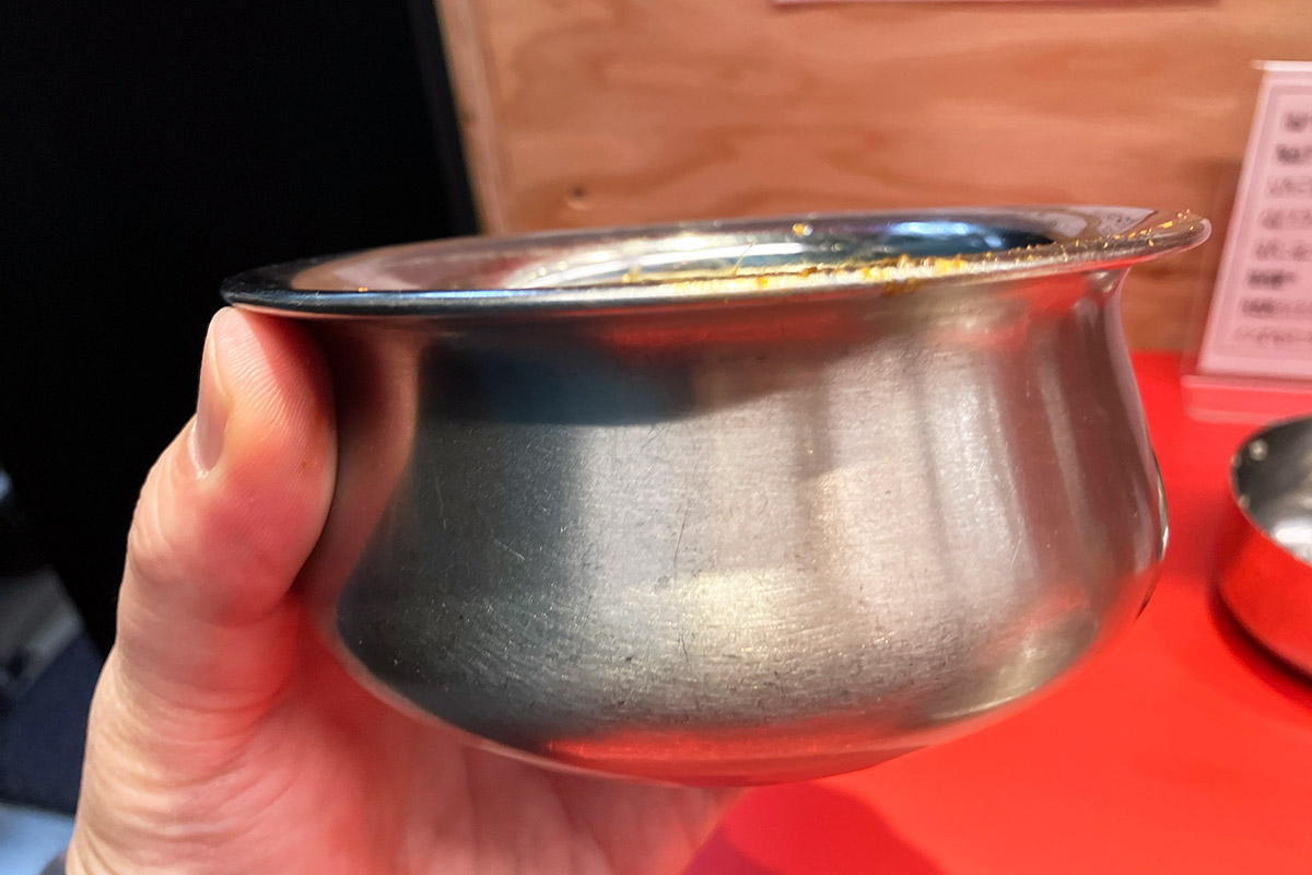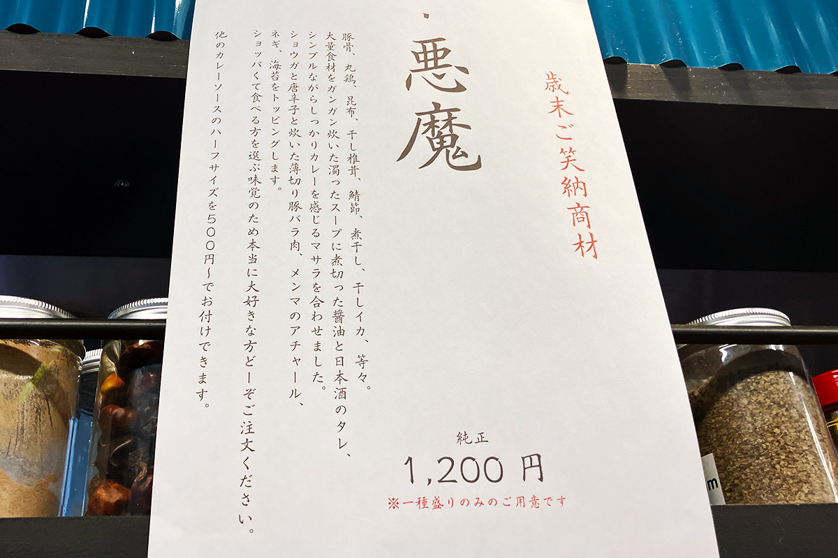 確かに、「悪魔」1200円(税込)というメニューがある。説明書きを読むと、なんだかカレーっぽくない素材の名前が並びスープが作られていることが分かる。そこに、醤油と日本酒のタレ? ますますカレーとは思えないが、実食するしかない。
