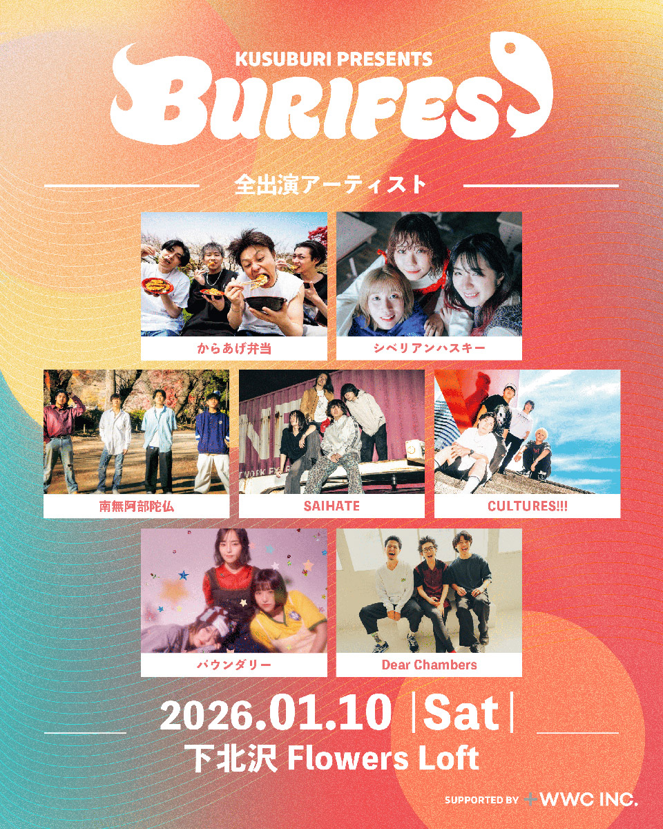2026年1月10日(土)Flowers Loftにて、からあげ弁当 ・シベリアンハスキー ・南無阿部陀仏 ・SAIHATE ・CULTURES!!! ・バウンダリー ・Dear Chambersの7組が出演する音楽イベント「BURIFES vol.1」が開催されます。