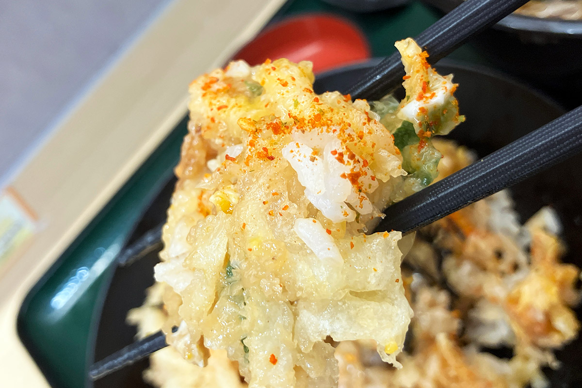 かき揚げ天を玉子とじにしてお米にオン! かき揚げ天に並々ならぬ自信を持つ箱根そばだからこそできるメニュー。もちろん初めて味わいましたが、これがめっちゃいい! 出汁と玉子がからみ、ご飯がめっちゃ進む!! もはや、この丼だけでも十分かも。