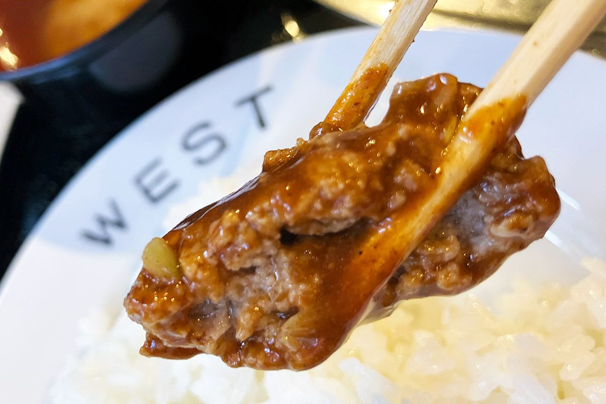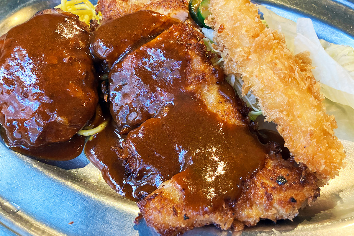 いや、もう、ライスの皿が完全に『WEST』ですし、銀皿に載ったハンバーグとポークカツ、そして海老フライが完全にあの「Bランチ」ですって。まあ、ナイフとフォークではなくお箸だしお味噌汁もついてて、さらにはお盆に載ってるのでちょっと違いますけどね。