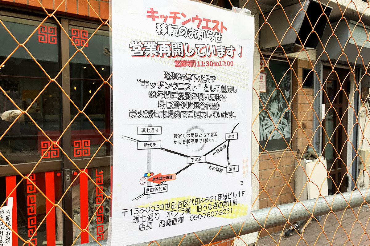 なんと『キッチンウエスト』が、世田谷代田駅近くの『炭火環七市場』で営業再開のお知らせでした! これは、実際に行って確かめなければなりません!!