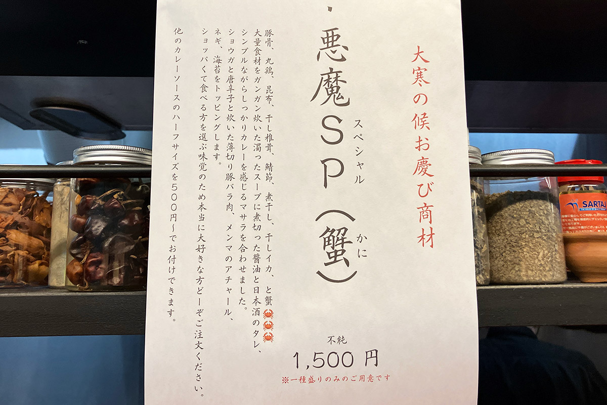 2025年末に『オイシイカレー(通称)』が期間限定で提供していた、しもブロでもご紹介した「悪魔」という名のカレー。年明けにインスタで「悪魔SP(蟹)」なるメニューを提供していると知り、味わってきました。