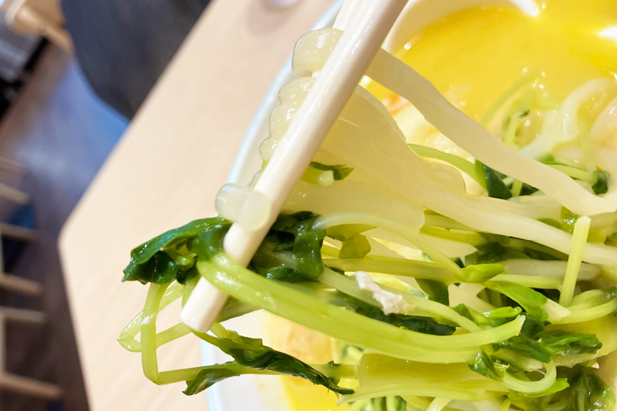 まずはスープを一口、酸味と辛さが程よい味わい。これまで麻辣湯で酸味を感じたことはほとんどありませんでしたが、これはこれで興味深い味わいですねー。唯一残念だったのは、パクチーがなかったこと、、、麻辣湯には欠かせないお野菜だっただけに。まあ、豆苗でも美味しいですけどねー。