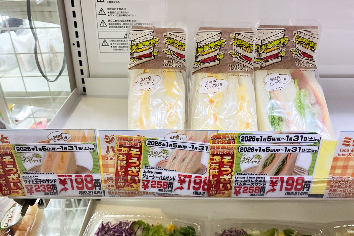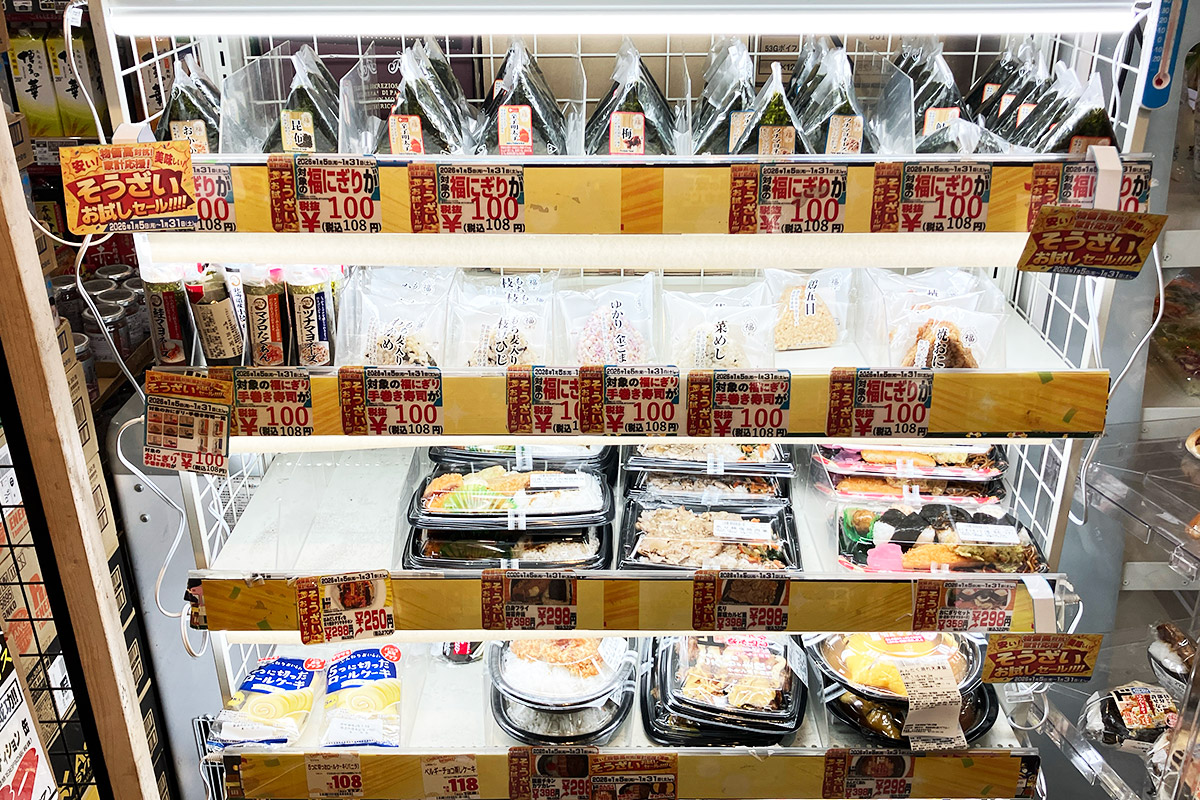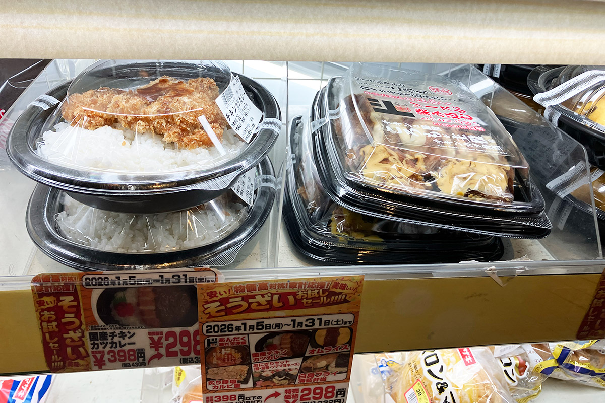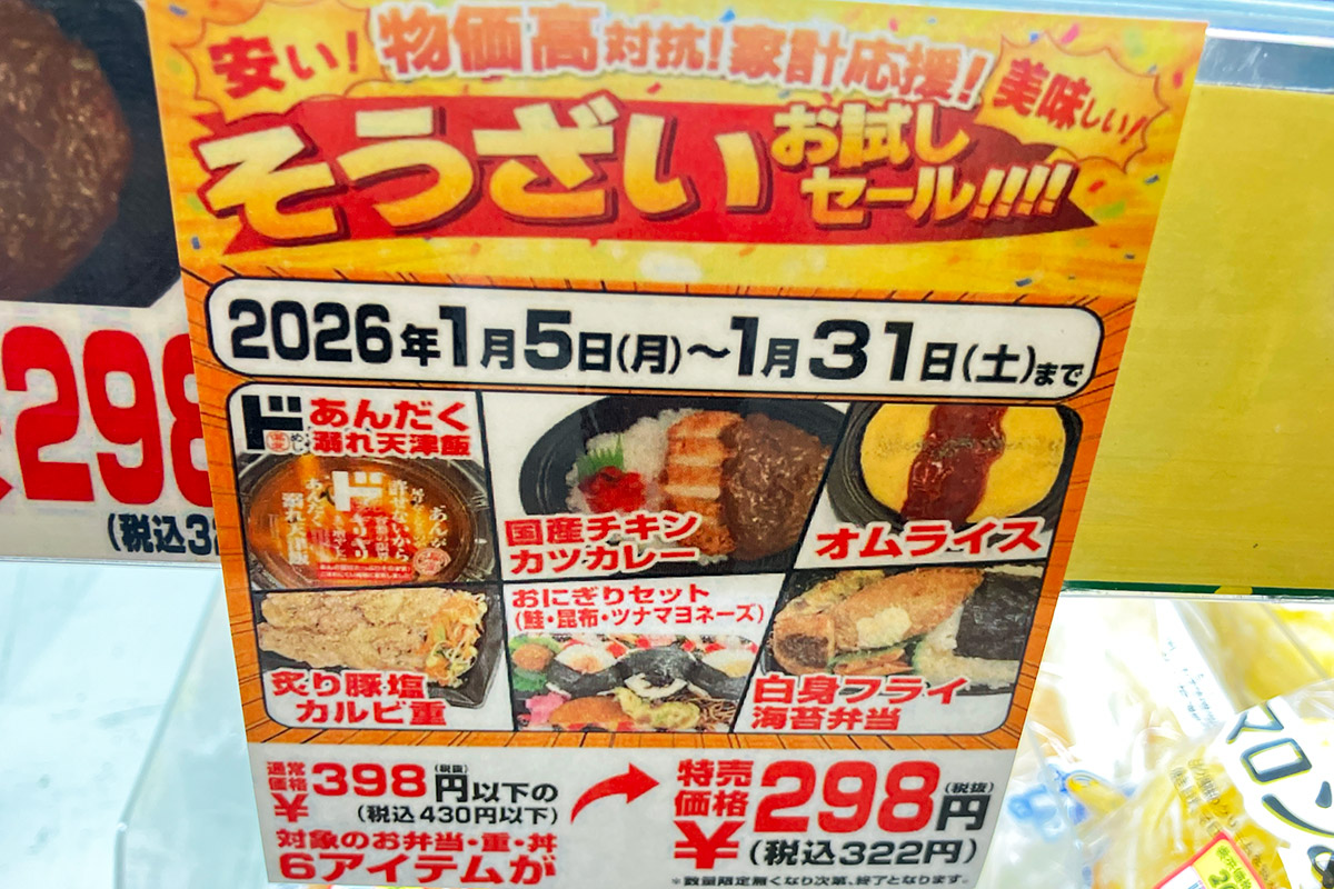 そう、以前存在していた398円(税別、以下同)弁当が復活し、さらには1月末まで“そうざいお試しセール!!!!”として、398円以下のお弁当類が100円引きの298円で販売されているじゃないですか! ちなみにお弁当のみならず対象のおにぎりと手巻き寿司についても100円と、めっちゃお得なのです!!