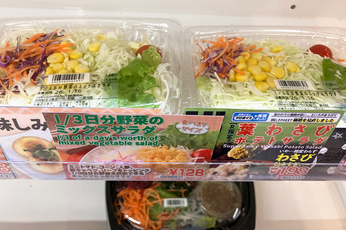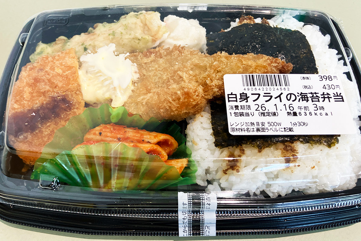 というわけで、「白身フライの海苔弁当」298円(お試しセール価格)と「1/3日分野菜のミックスサラダ」128円を購入しました。