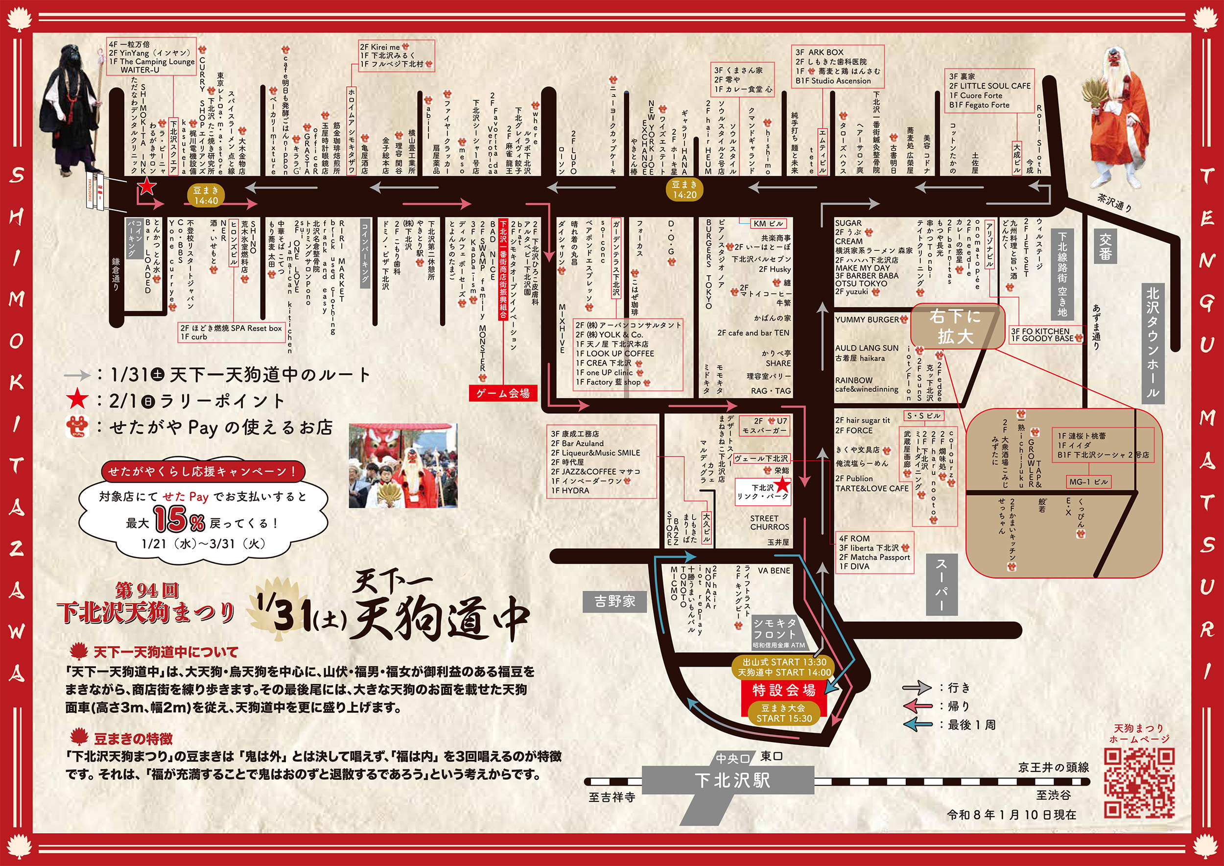 『下北沢天狗まつり』は、毎年冬の時期に下北沢で開催され続けている節分祭で、今年で94回目の開催となります。一般的な節分祭とは異なり鬼の代わりに天狗が出没し、「福は内」を3回となえ豆をまくのが大きな特徴で、地元住民に加え国内外から多くの観光客が訪れるお祭りです。