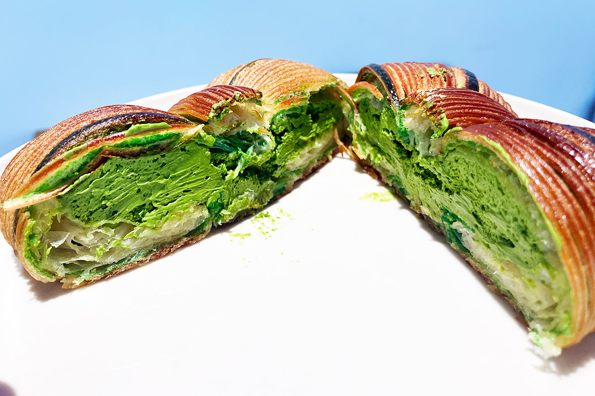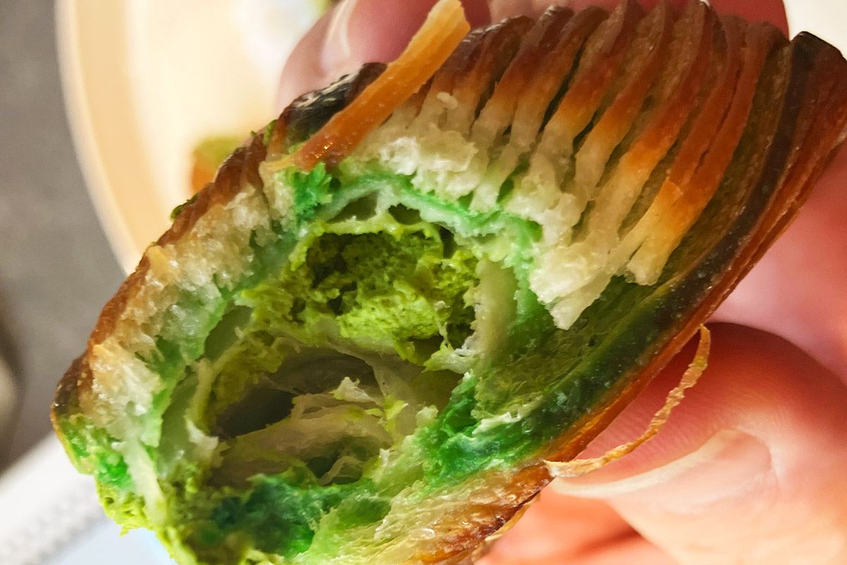 「リボンデニッシュ」は想像以上に大きく、カットしてみると中には抹茶クリームがぎっしり詰まっています。このクリームが予想以上に抹茶感がしっかりとしていてびっくり、ディニッシュ生地にも抹茶が練り込まれており、まさに抹茶を味わえる一品です。サイズが結構大きいので、カットしてシェアするのもアリですね。