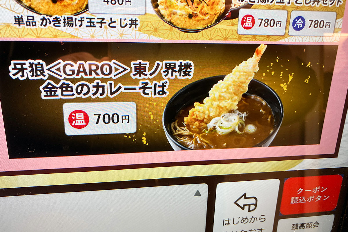 券売機の期間限定メニューから「金色のカレーそば」を選択