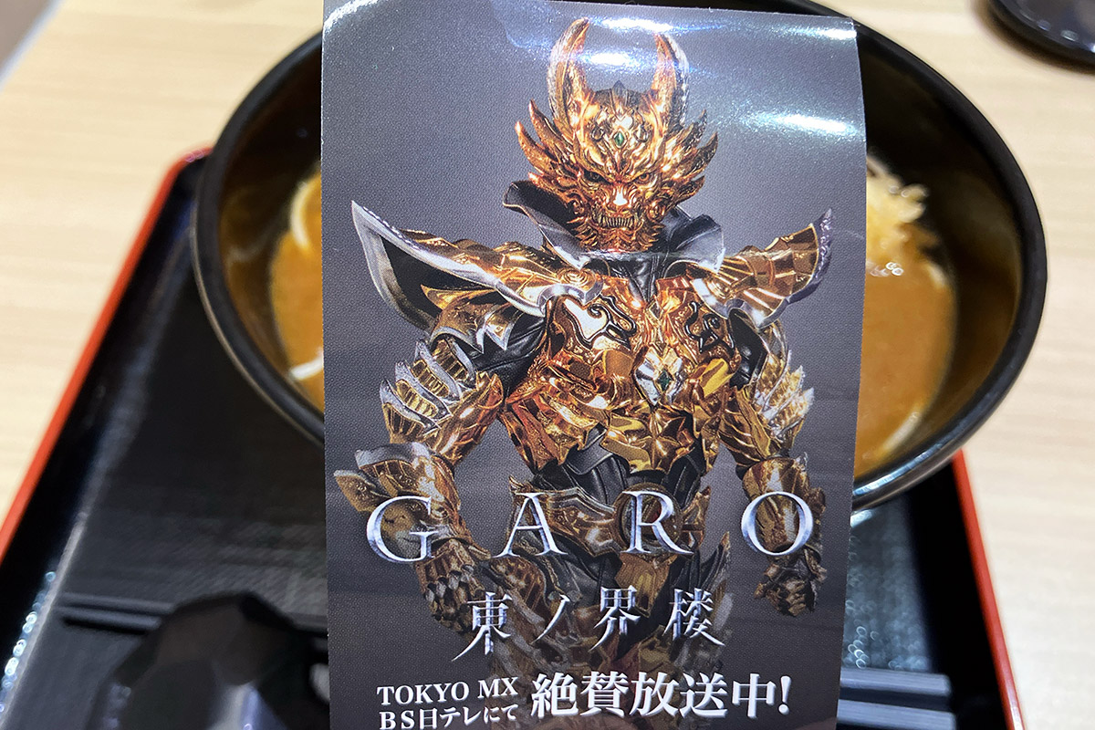 「金色(こんじき)のカレーそば」は、黄金騎士ガロ翔と砂の街・サガンをイメージしたメニューで、だしの効いたつゆのカレーそばは、体を芯から温めてくれます。また、コラボメニューをご注文いただいた方には、先着でオリジナルステッカーが1枚プレゼントされます。