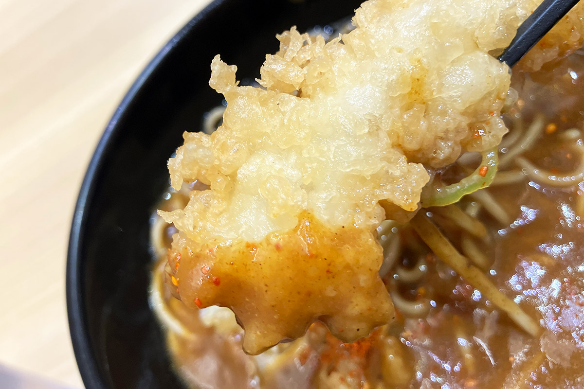 はい、単純にカレーそばのエビ天トッピングというだけですが、なんだかとても贅沢な気分に。実際にエビ天にカレーをつけて食べた事なんてないですからね。箱そば公式Xではライスをつけてましたが、確かに最後に丼に投入したくなりますね。