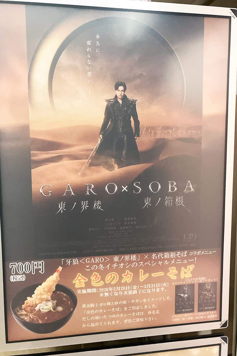 2026年2月20日(金)から3月31日(火)まで下北沢店を含む箱根そば全店にて、現在放送中の『牙狼<GARO> 東ノ界楼』とコラボレーションした期間限定メニュー「金色(金色)のカレーそば」が発売されます。
