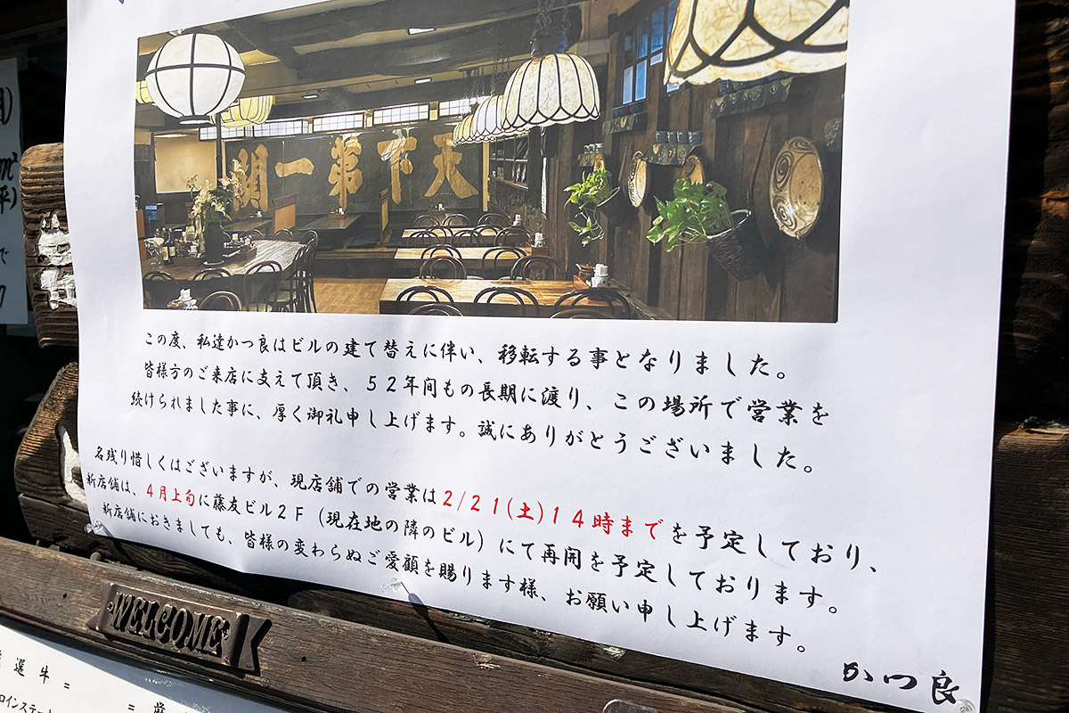 茶沢通り沿いにあるとんかつ・ステーキ専門店『かつ良』が、2026年2月21日をもって現在の店舗での営業を終了し、4月上旬に藤友ビル(道路を挟んだ向かい側のビル)の2階に移転します。52年間にわたりこの場所で営業してきた老舗飲食店、あの雰囲気を味わうべくランチにおじゃましました。
