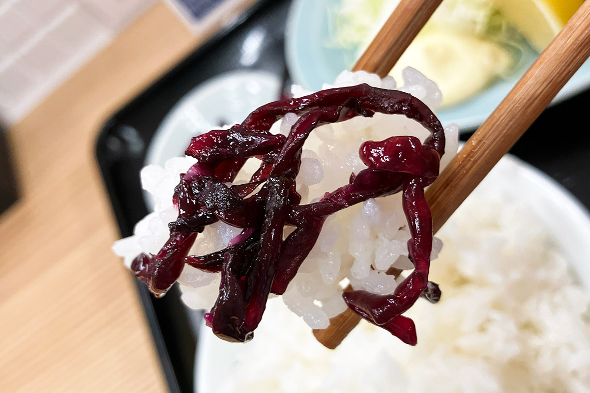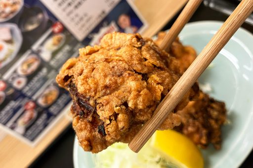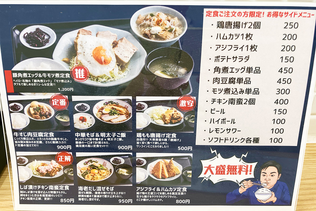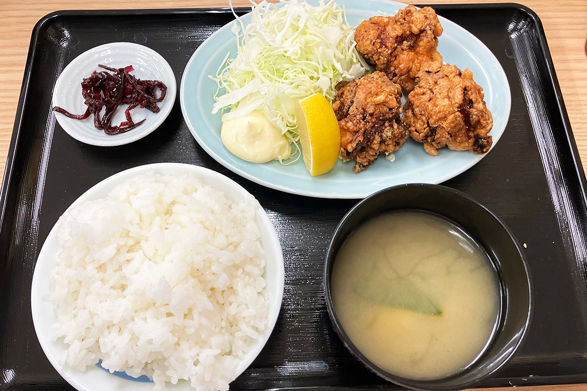 大衆食堂とのことで、もちろん定食メニューも揃っています。7つある定食の中から、一際目を引く「鶏もも唐揚げ定食」500円(税込、以下同)をオーダーしました。だって、この時代に500円ですよ、しかも税込ですよ!!
