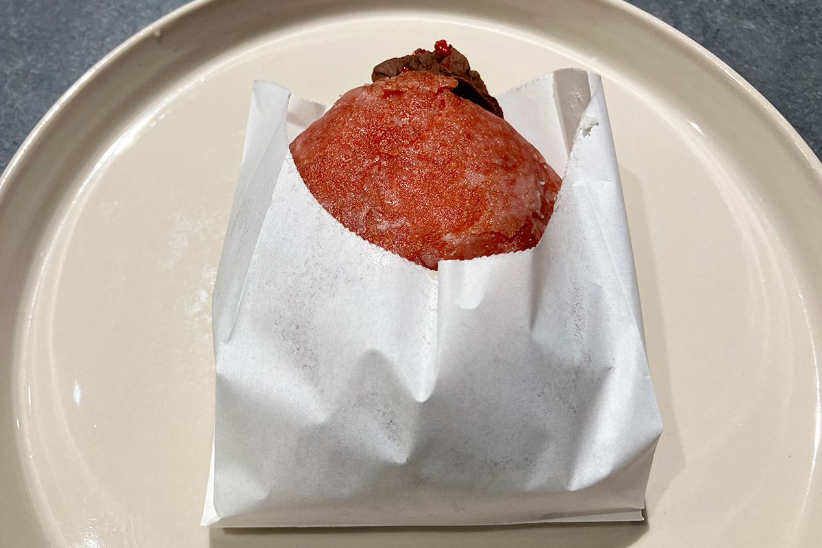 そう、カットしてびっくり! 中にはたっぷりチョコクリーム、そして生地の色の鮮やかさが印象的です。甘く滑らかなチョコクリームと、酸味が感じられるベリーソースの相性が抜群です。それにしてもとてつもなく美味しい、もはやヴィーガンであることは完全に忘れてしまいます。