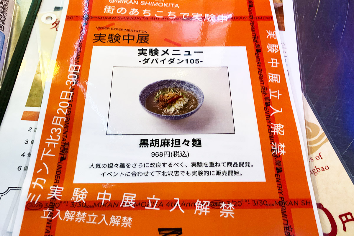 3月20日から30日まで開催中、ミカン下北開業4周年記念イベント「実験中展 -立入解禁- 」。飲食店の実験メニュー、まず最初にご紹介するのはダパイダン105の「黒胡麻担々麺」です。