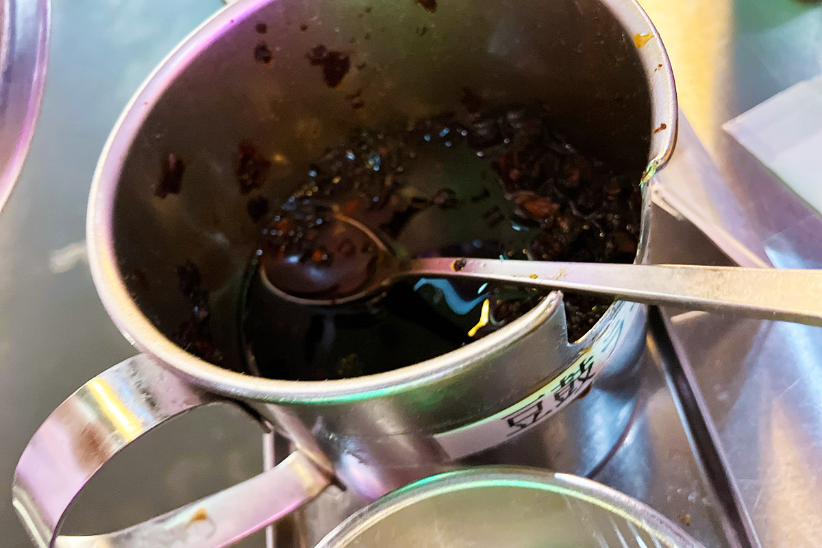 実験メニューにさらなる実験要素を加えるべく、卓上にある豆豉ラー油を入れてみる。実はあまり辛くないけど、深みのあるコクが加わりより旨い。そして、より白米が食べたくなる、、、。