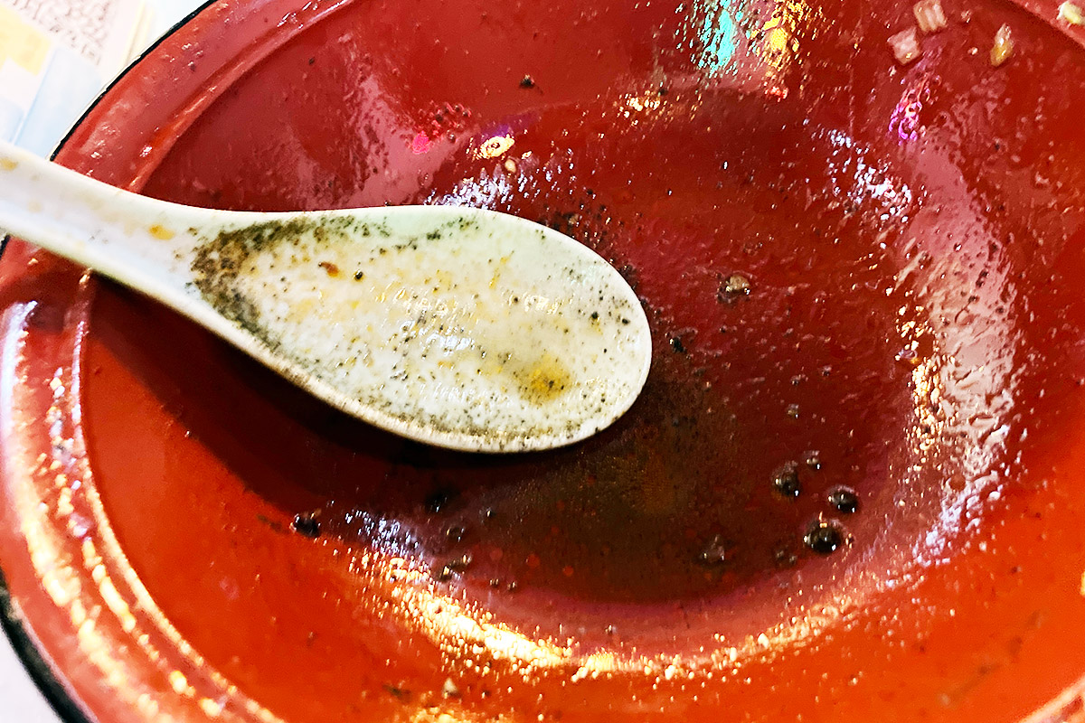実験メニューにもかかわらず、黒胡麻の利いたスープが美味しすぎて完食です! いやー、実験成功ですよ、完全に!!