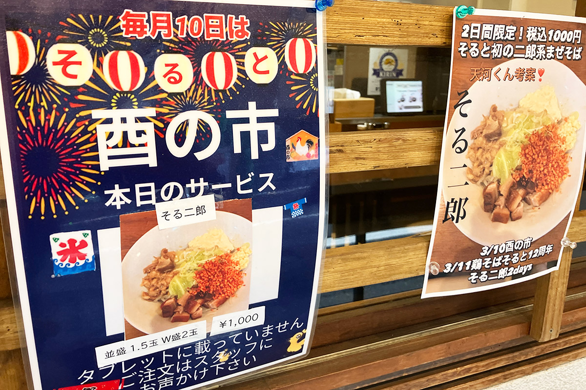 『鶏そば そると』は毎月10日に酉の市としてサービスメニューを提供していますが、3月は11日が創業日ということもあり2日連続でスペシャルメニューが提供されます。