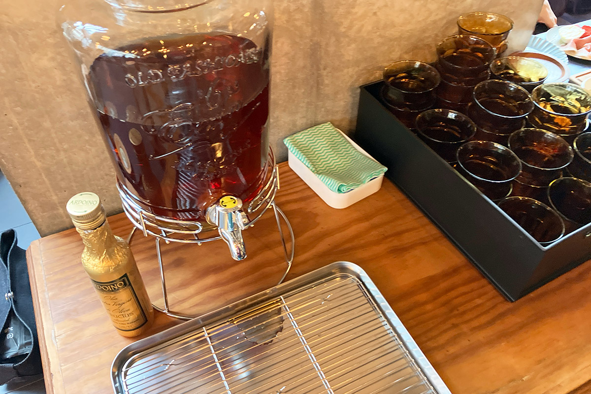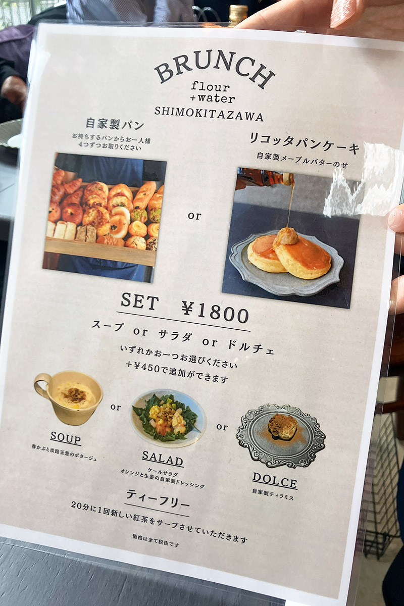 「ブランチセット」1800円(税抜、以下同)は、「自家製パン4種」か「リコッタパンケーキ」のどちらかを選んだ上に、「スープ」「サラダ」「ドルチェ」の中から1つ選びます。尚、冷たい紅茶はセルフで、さらにティーフリーで20分に1回新しい紅茶がサーブされます。ちなみに、こちらの「ブランチセット」は10時から14時までで、90分制となっています。