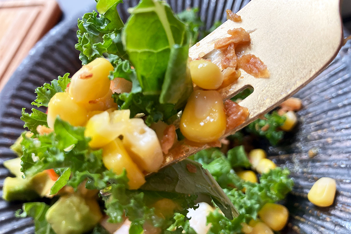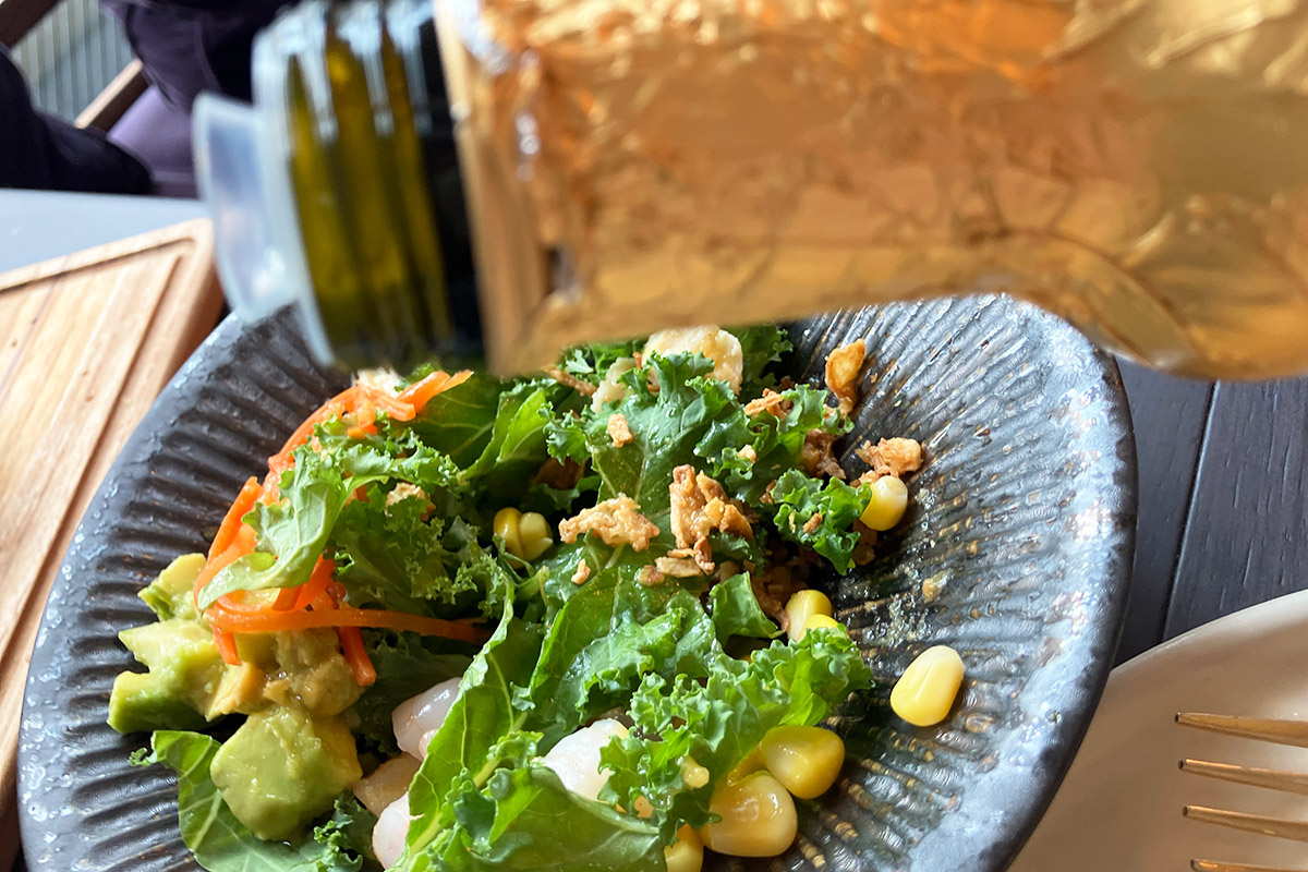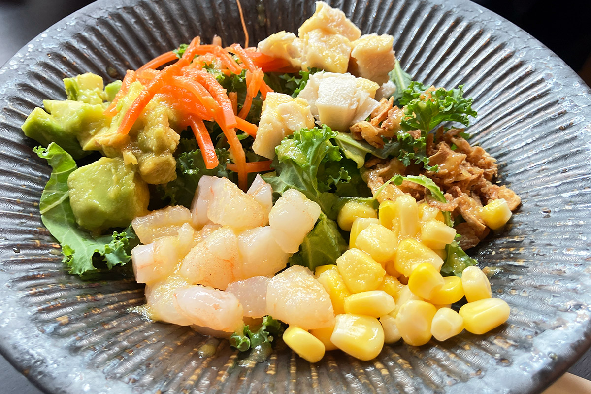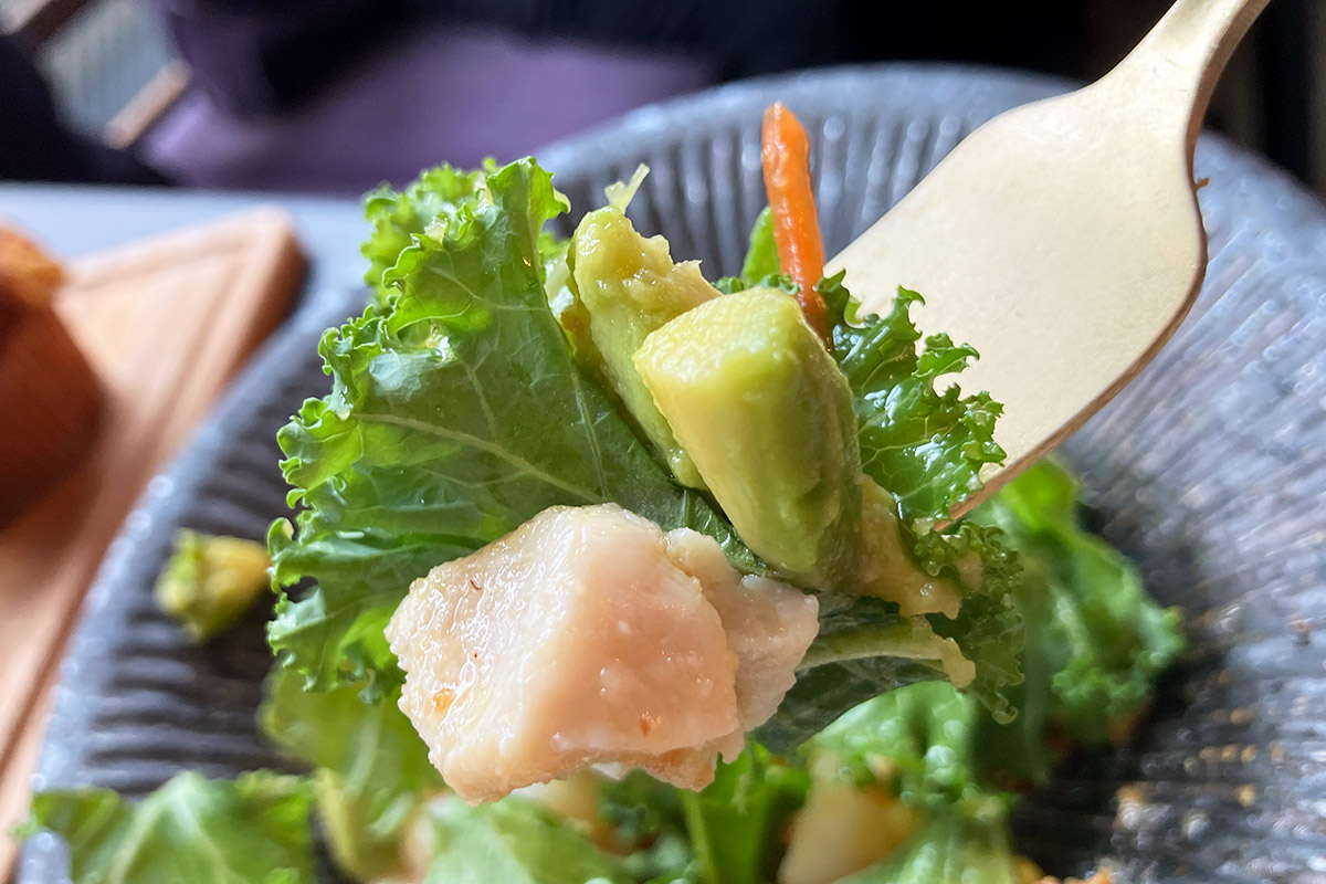 具材たっぷり見た目鮮やかなサラダは、食べ応え十分。なんか葉物がおしゃれすぎて何なのか全く分かりませんがクセも無く、チキンやエビ、そしてアボカドと味わいもとーってもカラフルです。
