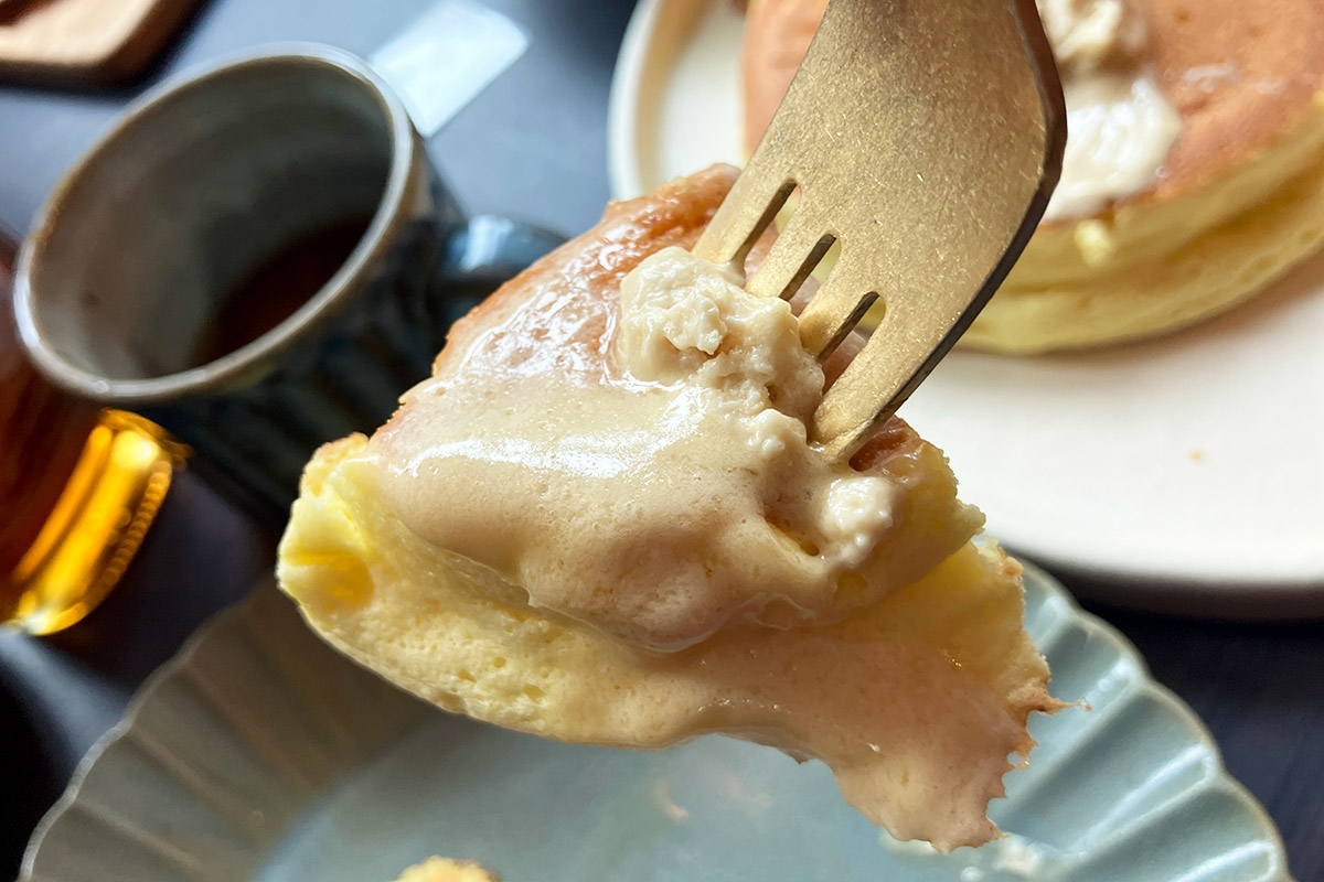 リコッタチーズを使った「リコッタパンケーキ」を初めて味わいましたが、自家製のメープルバターを載せメープルシロップをかけることにより、言葉にできない幸せを実感。はい、美味しいを超えた世界がそこにありました。もちふわ~~!