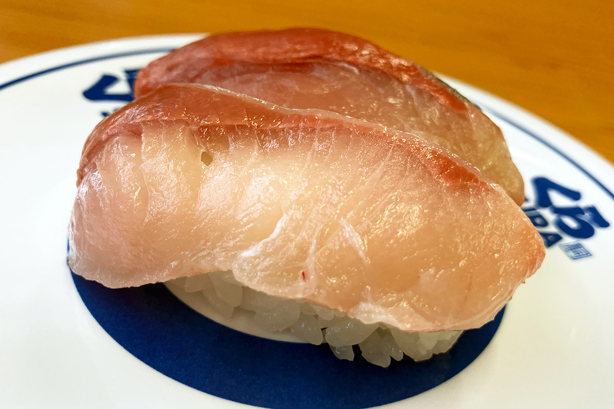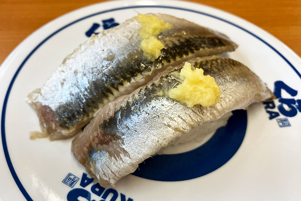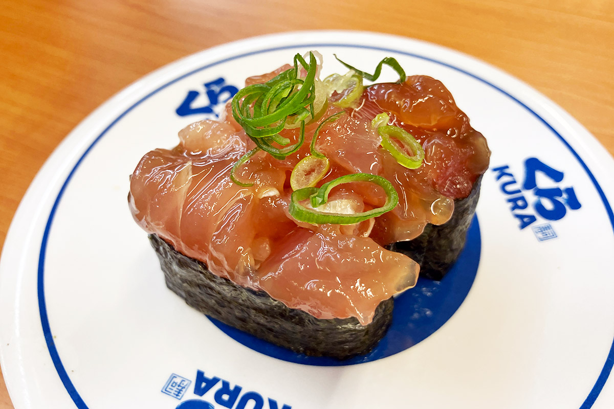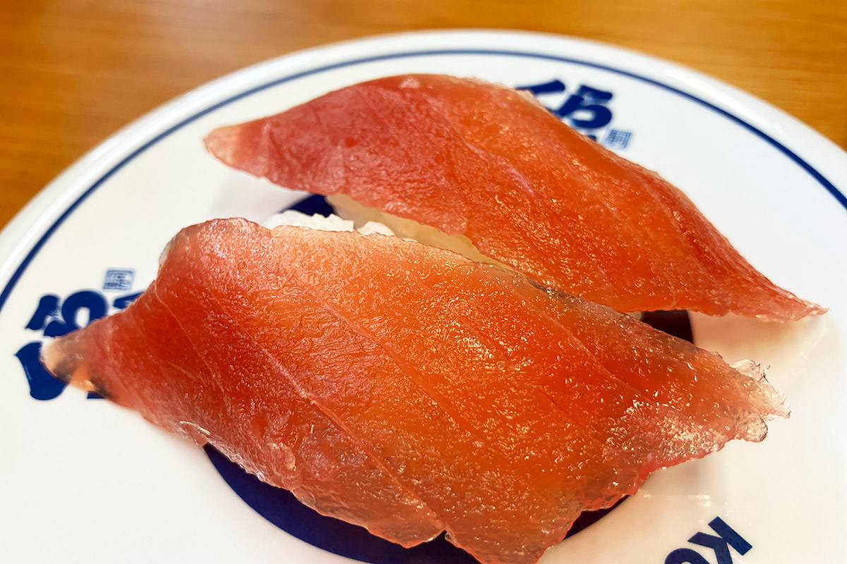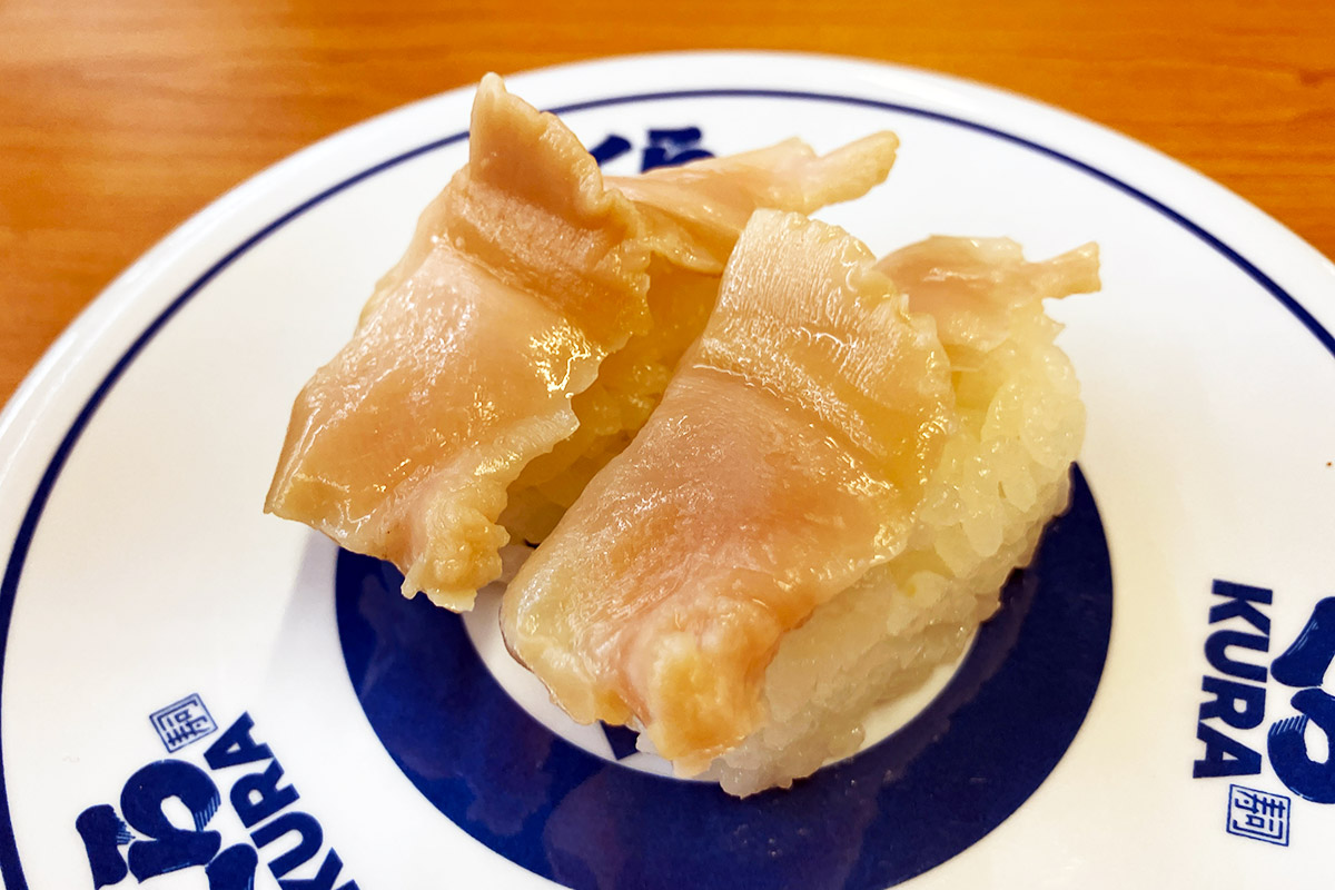 で、空いた皿にガリを載せるわけですが、そこには「無添加大根ガリ」の文字が。え、どういうこと、大根のガリって? 説明しよう!くら寿司では2023年12月より、ガリが生姜から大根の甘酢漬けに変更されたのだっ!! へー、全然知らなかった、生姜に比べても辛味が少ないのでキッズでも食べやすいかも。