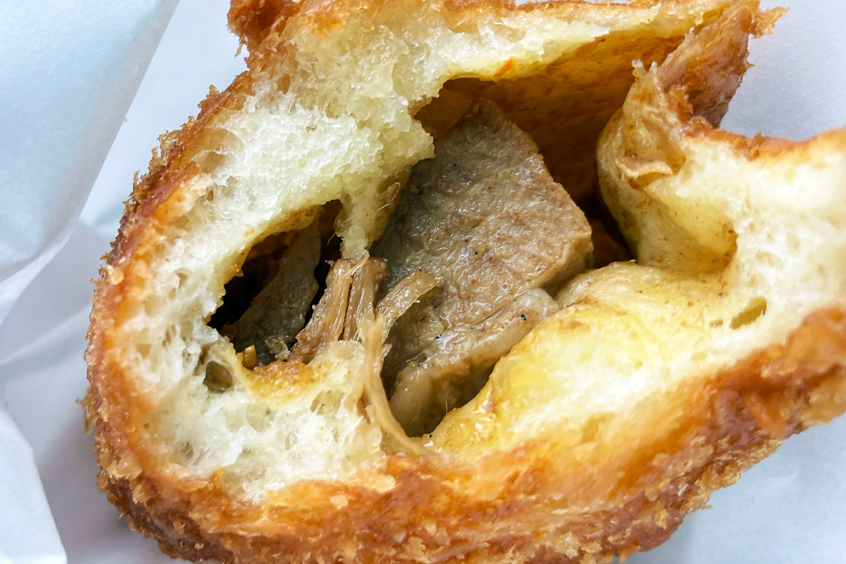 そう、所詮カレーパン、豚の角煮と言ってもちょっとお肉を感じるレベルだと思っていたが、実際には完全に角煮、これが2つくらい入ってて完全に豚の角煮カレーパンだった。なんというか、カレーパンなのに豚の角煮の存在感が強すぎて訳が分からない感じだった。当然ですが旨いに決まっています、豚の角煮×カレーの破壊力を思う存分感じる結果となりました。