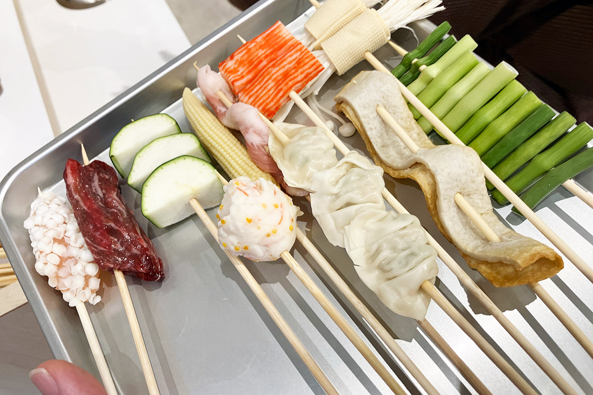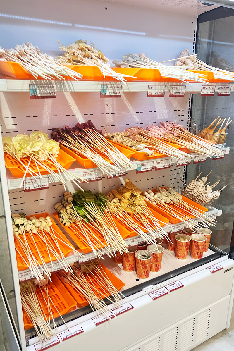 店内に入ると中央には、串に刺さった具材がずらりと並ぶショーケースが。注文方法にも書かれているとおりで、好きな具材の串を選びレジに持って行きます。