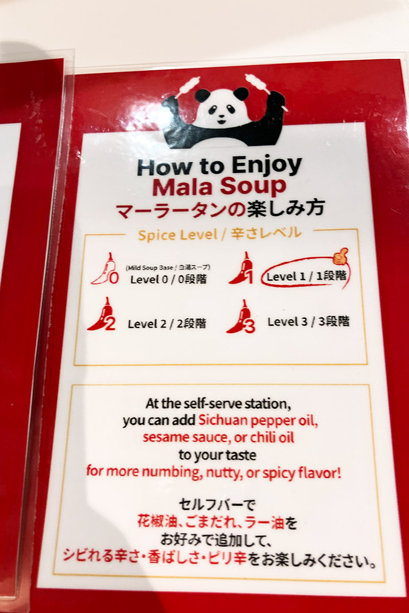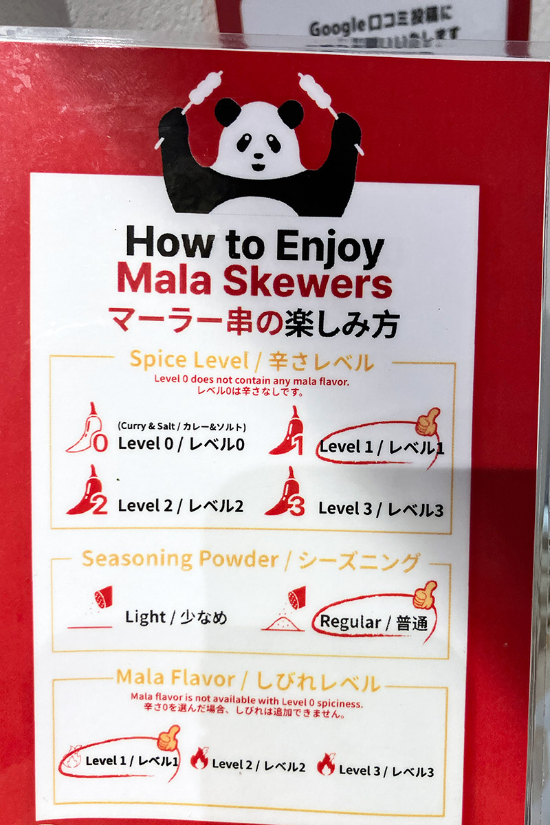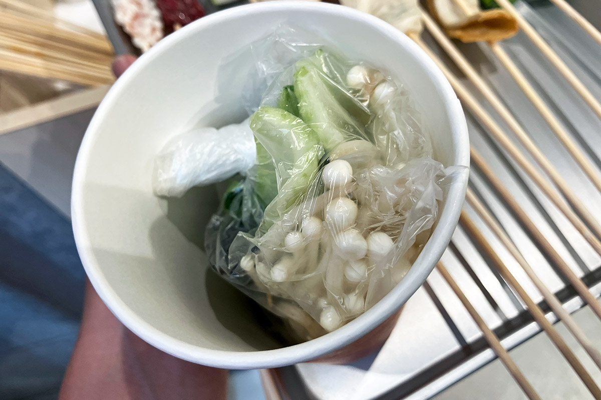 実際に好きな具材の串を選ぶわけですが、これがなんだか楽しい! 一般的な麻辣湯専門店も具材を自分で選ぶタイプのお店が多いですが、串に刺さった具材というのがとても新鮮で、楽しいわけです。レジで辛さや痺れを選択し、お会計して待ちます。