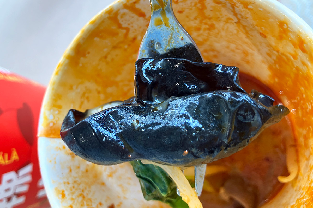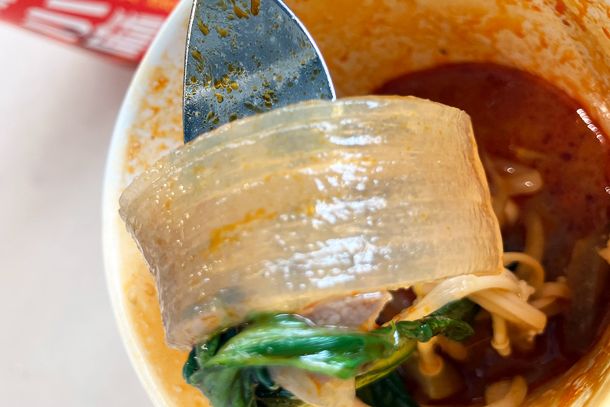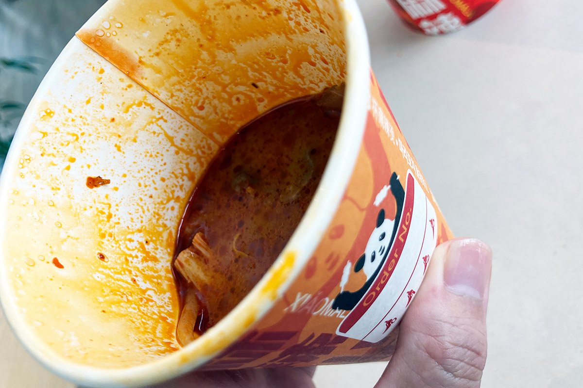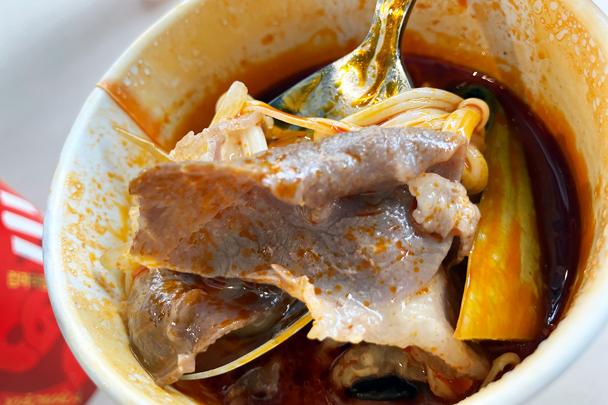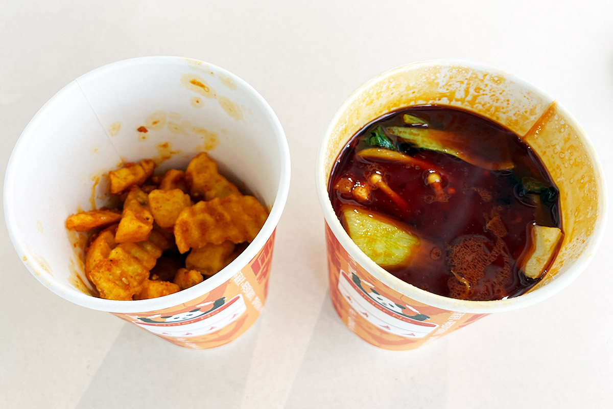 一見するとコーヒーのようなカップに入っている「カップ麻辣湯」、ラム肉を追加したのでたっぷり具材でレギュラーサイズでも満足感は抜群。そして、レベル3にしたこともあり、しっかりと辛い。辛さを求める皆さんも満足できます。